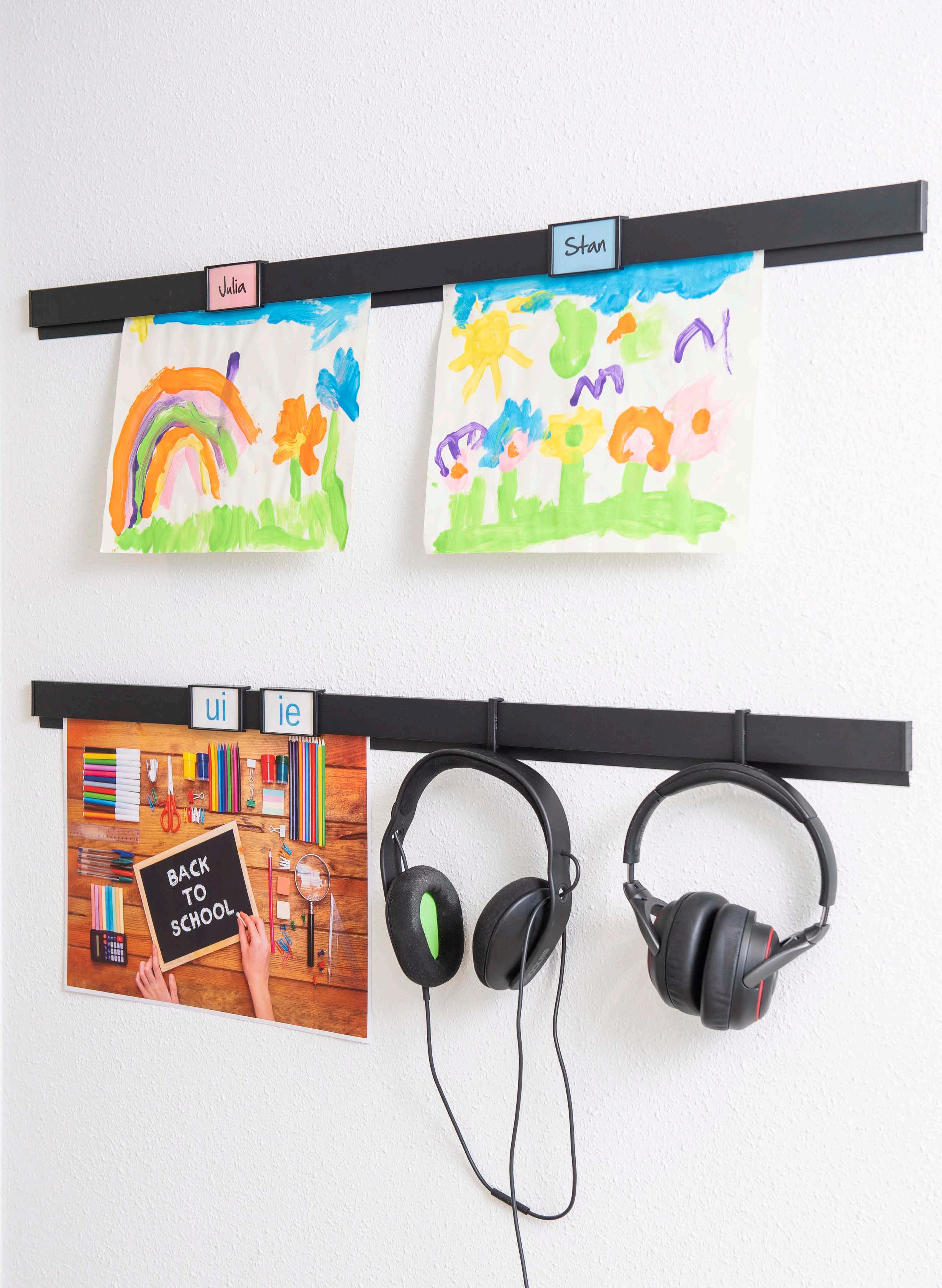 Binnen het schoolgebouw, in de klaslokalen of in de lerarenkamer kan het zijn dat bepaalde wanden net te smal zijn voor het plaatsen van de Info Rail. Maar wat wel een plek is waar wat moois gepresenteerd kan worden. De Card Rail is een verticale versie van de Info Rail en neemt weinig ruimte is. Aan weerszijden van de Card Rail kunnen tekeningen, foto’s of andere kaarten opgehangen worden. Tevens is de voorkant van de Card Rail voorzien van een magnetische strip. Het resultaat is het speels ophangen van de tekeningen!