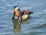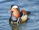 These birds are amenable to life in park lakes and along riversides and are popular captive birds because of their remarkably spectacular plumage. Male mandarin ducks have elaborately, decorative plumage sporting distinctive orange feathers on the cheeks, purple chest, and large dorsal, orange feathers sticking up sail-like, and with pale, orangecoloured flanks. Females are duller with grey head and a distinctive white stripe behind the eye, a brown back and mottling on the lower sides. The males also have an amazing pink beak with a white tip.