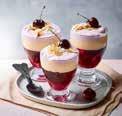 cut the sponge into small cubes and arrange in 4 tall glasses. Divide the halved cherries between the glasses, too.
