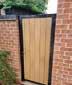 9. After a short distance pass through a width restrictor and then cross over a metal bridge. Continue straight ahead passing houses on your left. After leaving the houses behind you will pass over a short concrete section of the path with a large wooden gate on your right. After this bear left and gently uphill along a path running parallel.