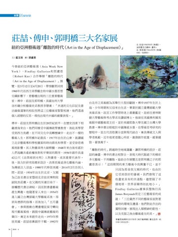 今春紐約亞洲藝術週(Asia Week New Yo r k ) , F i n d l a y G a l l e r i e s 和 郭 盧 恩 (Robert Kuo)合作舉辦「離散的時代 (Art in the Age of Displacement)」展 覽,從3月12日至4月20日,帶領觀眾回到 1960年代在西方美學觀念和中國水墨思想 交織影響下,看藝壇出現的三位重要藝術 家:傅申、莊喆及郭明橋。美國加州大學 洛杉磯分校藝術史系教授李慧漱:「共通的文化印記及書 法線條運筆的相似性將這三位藝術家緊緊相連,他們透過 個人經歷的反思,尋找出現代中國的視覺表現。」