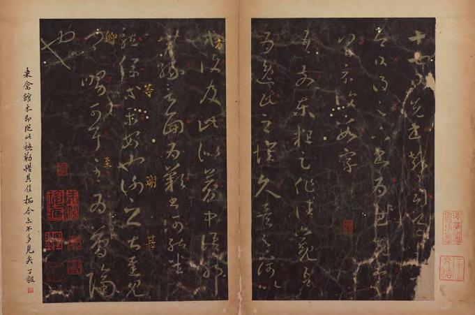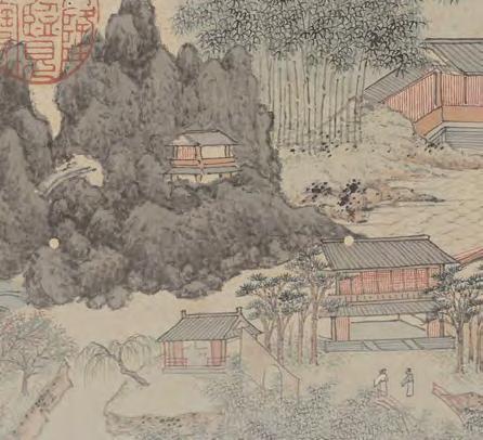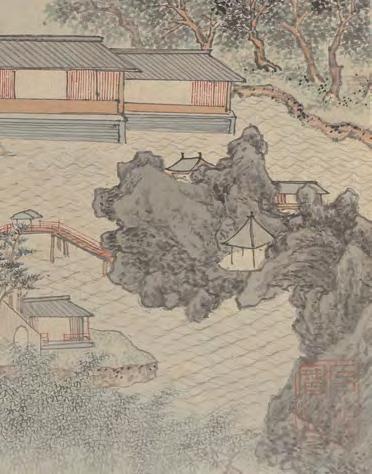「古代書畫夜場」以清宮宮廷畫家合 繪《壽意圖冊》十二開領銜全場,由 作品款題可知此冊由八位康熙至乾隆 初年的宮廷畫家合繪,可能是為了雍 正皇帝五十歲壽誕而作,後經乾隆、 嘉慶、宣統三位皇帝典藏。除了畫 面精描工繪,其裝裱材料以高規格的