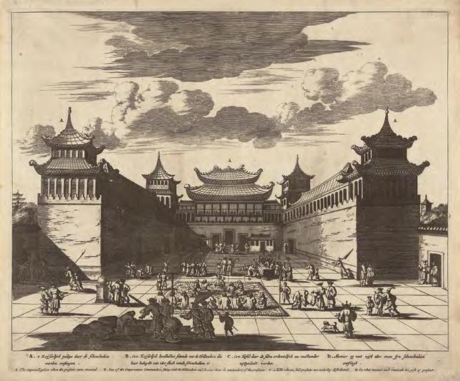 荷蘭東印度公司使節分別於 1657、1664 及 1668 三次北上深入中國領土,試圖能夠在 貿易自由度上獲得突破,無奈無論是順治或 者是康熙皇帝,都沒人鬆口讓荷蘭東印度公 司能夠在中國領土上直接進行貿易。看似無 功而返的旅程,卻也留下了不少圖繪紀錄, 讓我們能夠以荷蘭人的角度看到當時的中國 (圖 1)。