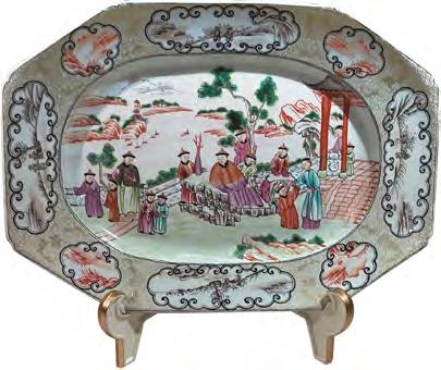 外銷瓷顧名思義是專為銷售國外而製作的 瓷器,在設計上迎合海外顧客需求,能夠 體現當時東方工匠的精湛技藝與西方市場 的口味喜好。民間流行的中國傳統紋飾, 舉凡山水人物、花鳥瑞獸、傳奇故事等, 是貿易瓷常見的裝飾圖案,讓西方顧客得 以窺探歐亞大陸彼端的神祕世界,滿足他 們對異國的好奇心。像是描繪清朝地方官 員家庭生活的「滿大人」圖樣就是當時熱 門的裝飾題材之一(圖 2),而盤緣以繁 複花紋為底,對稱分隔開光為飾,也是中 國外銷瓷常見的裝飾手法。除此之外,為 符合歐洲習慣的生活用具,各種特殊器型 也應運而生。同樣地,過去不見於中國瓷 器上的歐洲家族徽章、西洋神話故事等圖 樣,像是:希臘神話中特洛伊戰爭的導 火線「金蘋果事件」,或西方四元素地、 水、火、風(圖 3)等,亦在歐洲商人的訂