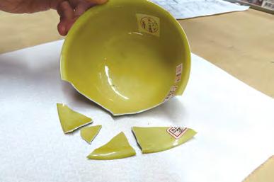 清〈弘治款嬌黃綠彩雙龍小碗〉破損情形。圖/國立故宮博物院。