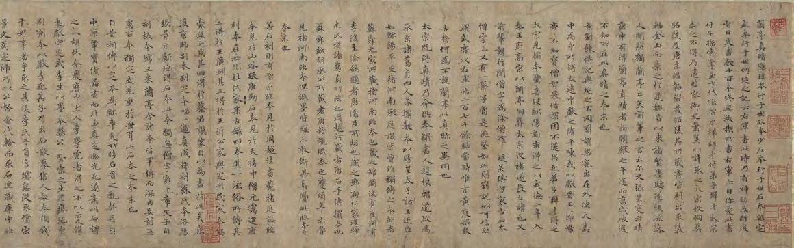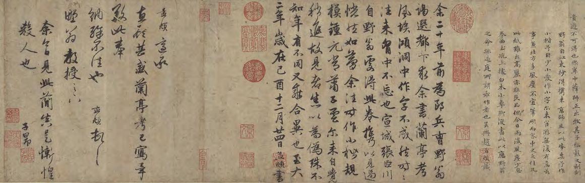 趙孟頫〈書禊帖源流〉卷包含〈禊帖源流 考〉、題跋和致野翁信函,後人將其合裝一 起(圖 1)。〈禊帖源流考〉是趙孟頫受野翁 之託,以小楷抄寫的南宋姜夔〈蘭亭考〉, 據卷後自跋:「余二十年前為曹野翁謁選 都下,求余書〈蘭亭考〉」,署款「至大二 年歲在己丑十二月廿四日」,知此小楷書 於 36 歲。20 年後,宣城張巨川從曹野翁處 得此卷,請趙孟頫作跋,他感慨:「恍然如 夢。余往時作小楷,規模鍾元常、蕭子雲, 爾來覺稍進,故見者悉以為偽,殊不知年 有不同,又乖合異也。」同時在當年致曹野 翁函後面寫下:「余今日見此簡,真是慚惶 殺人也。」
