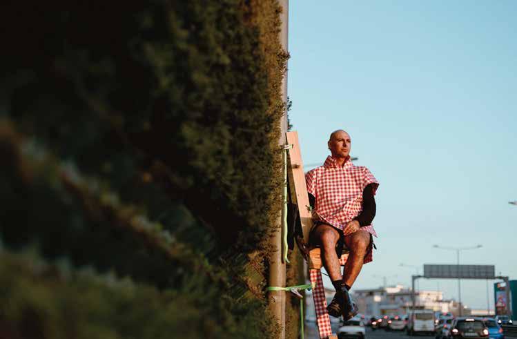 SUNSET PICNIC A vertical performance and protest by artist Keit Bonnici - a picnic held up a ladder on the green wall of Marsa-Hamrun bypass, reimagining nature, visibility, and public space in urban Malta.