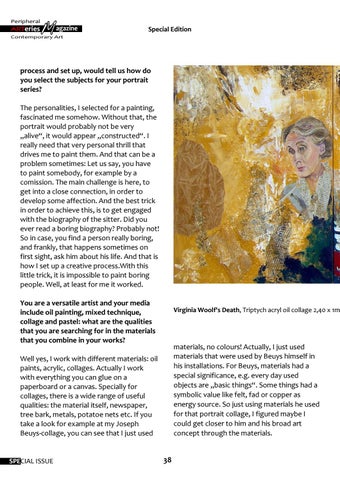 process and set up, would tell us how do you select the subjects for your portrait series? The personalities, I selected for a painting, fascinated me somehow. Without that, the portrait would probably not be very „alive“, it would appear „constructed“. I really need that very personal thrill that drives me to paint them. And that can be a problem sometimes: Let us say, you have to paint somebody, for example by a comission. The main challenge is here, to get into a close connection, in order to develop some affection. And the best trick in order to achieve this, is to get engaged with the biography of the sitter. Did you ever read a boring biography? Probably not! So in case, you find a person really boring, and frankly, that happens sometimes on first sight, ask him about his life. And that is how I set up a creative process.With this little trick, it is impossible to paint boring people. Well, at least for me it worked. You are a versatile artist and your media include oil painting, mixed technique, collage and pastel: what are the qualities that you are searching for in the materials that you combine in your works?