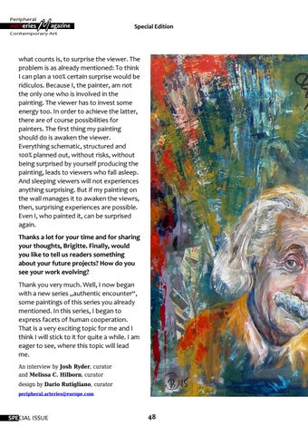 what counts is, to surprise the viewer. The problem is as already mentioned: To think I can plan a 100% certain surprise would be ridiculos. Because I, the painter, am not the only one who is involved in the painting. The viewer has to invest some energy too. In order to achieve the latter, there are of course possibilities for painters. The first thing my painting should do is awaken the viewer. Everything schematic, structured and 100% planned out, without risks, without being surprised by yourself producing the painting, leads to viewers who fall asleep. And sleeping viewers will not experiences anything surprising. But if my painting on the wall manages it to awaken the viewrs, then, surprising experiences are possible. Even I, who painted it, can be surprised again. Thanks a lot for your time and for sharing your thoughts, Brigitte. Finally, would you like to tell us readers something about your future projects? How do you see your work evolving? Thank you very much. Well, I now began with a new series „authentic encounter“, some paintings of this series you already mentioned. In this series, I began to express facets of human cooperation. That is a very exciting topic for me and I think I will stick to it for quite a while. I am eager to see, where this topic will lead me. An interview by Josh Ryder, curator and Melissa C. Hilborn, curator design by Dario Rutigliano, curator peripheral.arteries@europe.com