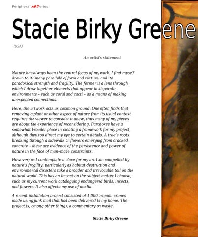 Nature has always been the central focus of my work. I find myself drawn to its many parallels of form and texture, and its paradoxical strength and fragility. The former is a lens through which I draw together elements that appear in disparate environments – such as coral and cacti – as a means of making unexpected connections. Here, the artwork acts as common ground. One often finds that removing a plant or other aspect of nature from its usual context requires the viewer to consider it anew, thus many of my pieces are about the experience of reconsidering. Paradoxes have a somewhat broader place in creating a framework for my project, although they too direct my eye to certain details. A tree’s roots breaking through a sidewalk or flowers emerging from cracked concrete – these are evidence of the persistence and power of nature in the face of man–made constraints. However; as I contemplate a place for my art I am compelled by nature’s fragility, particularly as habitat destruction and environmental disasters take a broader and irrevocable toll on the natural world. This has an impact on the subject matter I choose, such as my current work cataloguing endangered birds, insects, and flowers. It also affects my use of media. A recent installation project consisted of 1,000 origami cranes made using junk mail that had been delivered to my home. The project is, among other things, a commentary on waste. Stacie Birky Greene