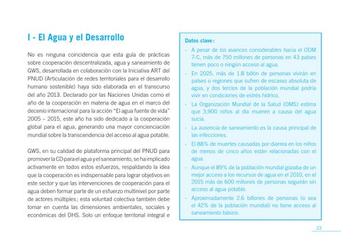 I - El Agua y el Desarrollo No es ninguna coincidencia que esta guía de prácticas sobre cooperación descentralizada, agua y saneamiento de GWS, desarrollada en colaboración con la Iniciativa ART del PNUD (Articulación de redes territoriales para el desarrollo humano sostenible) haya sido elaborada en el transcurso del año 2013. Declarado por las Naciones Unidas como el año de la cooperación en materia de agua en el marco del decenio internacional para la acción “El agua fuente de vida” 2005 – 2015, este año ha sido dedicado a la cooperación global para el agua, generando una mayor concienciación mundial sobre la transcendencia del acceso al agua potable. GWS, en su calidad de plataforma principal del PNUD para promover la CD para el agua y el saneamiento, se ha implicado activamente en todos estos esfuerzos, respaldando la idea que la cooperación es indispensable para lograr objetivos en este sector y que las intervenciones de cooperación para el agua deben formar parte de un esfuerzo multinivel por parte de actores múltiples ; esta voluntad colectiva también debe tomar en cuenta las dimensiones ambientales, sociales y económicas del DHS. Solo un enfoque territorial integral e