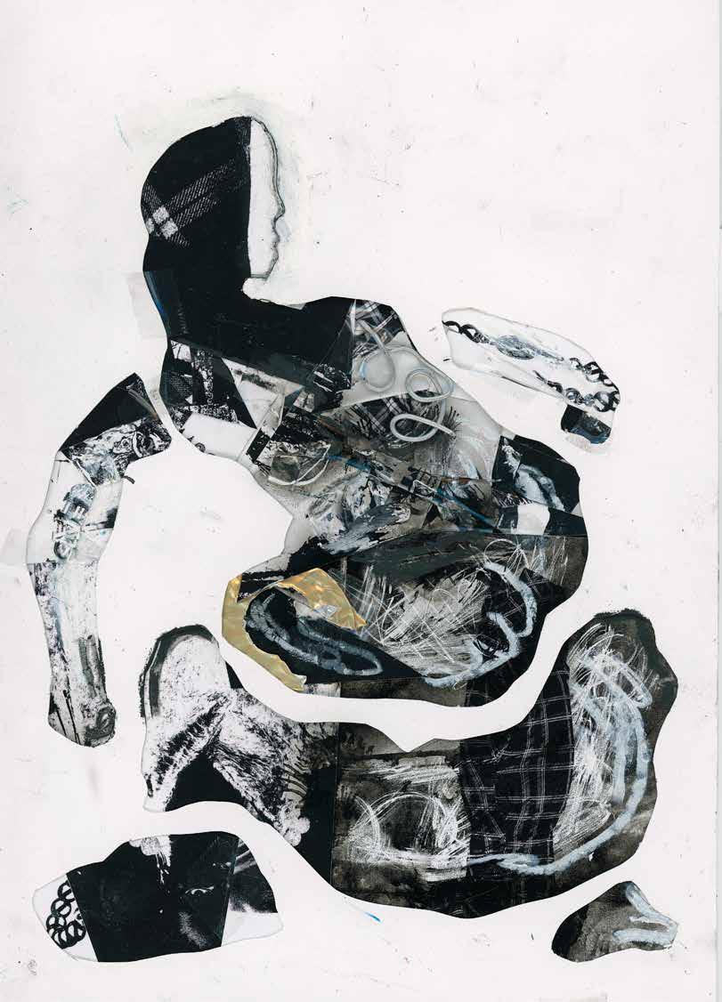 Con il collage, Anzalone esplora una tridimensionalità che rompe i limiti bidimensionali della carta e suggerisce nuove profondità visive. Centrale è l’approccio DIY: ogni composizione nasce da pratiche sperimentali in cui le immagini vengono decostruite fino agli elementi essenziali — toni e linee — e poi riassemblate entro silhouette espressive. Il risultato sono immagini crude e vibranti, che abbandonano la struttura originaria per acquisire una nuova identità all’interno dei propri contorni.
