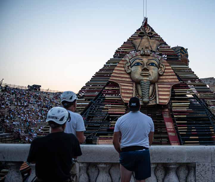 processo creativo, partendo dai bozzetti frutto del pensiero creativo di regista e scenografo; dai primi disegni esecutivi si passa alla realizzazione di un plastico in scala e contestualmente si valutano metodologia costruttiva e fattibilità tecnica tenendo conto di diversi fattori, tra cui i vincoli legati alla conservazione dell’Arena che, ad esempio, non consente di porre sulle gradinate strutture in ferro pesante.