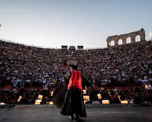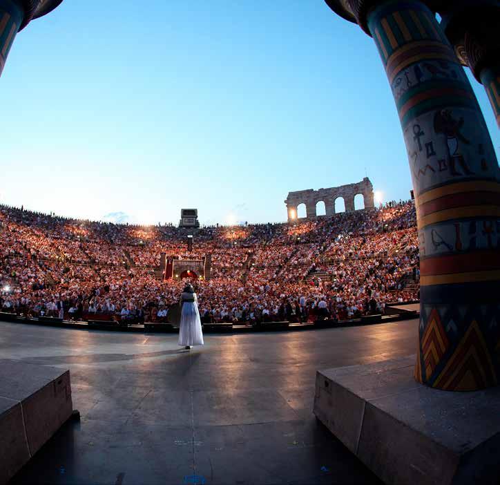 coro del Va’ pensiero, prima di far esplodere l’applauso e reclamare il bis che puntualmente, con grande generosità, viene concesso. La straordinaria esperienza dei quasi 160 artisti del coro e dei 150 professori d’orchestra fa superare i limiti derivanti dalle distanze: sono frazioni di secondo, ma questi tempi sono fondamentali per la buona riuscita dello spettacolo e fondamentali anche per i solisti. Spesso il caldo è torrido, oppure l’umidità e la temperatura più rigida possono non giovare agli strumenti; solo in Arena tutto questo è possibile. E mentre l’orchestra accorda gli strumenti, le luci si abbassano e tra gli arcovoli si sente pronunciare il famoso richiamo piazzato di scena, il pubblico fa silenzio e si prepara a vivere lo spettacolo accendendo le tradizionali candeline. Le migliaia di occhi si sgranano all’unisono e in quel brevissimo attimo di sospensione che precede l’entrata del direttore d’orchestra, si concentra tutto. E lo spettacolo ha inizio.