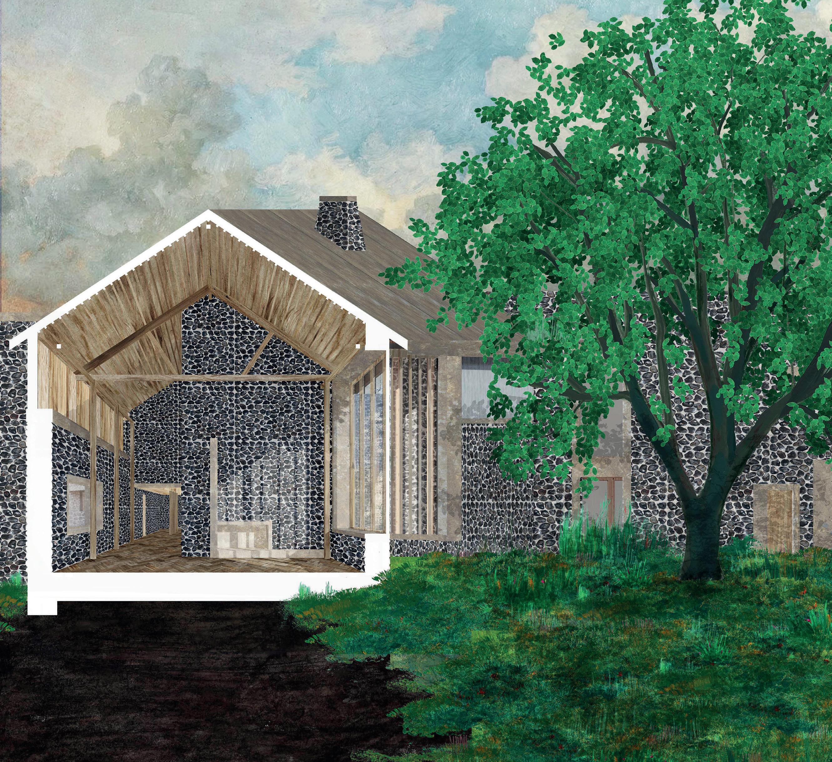 184 Ella Blue Wragg Ella Blue Wra gg _Unit 12_Th Garde 23 Exploring traditional green oak construction Suffolk Vernacular for Easton: Green Oak Lavenham Guildhall Green Oak Construction Case Study Photographs of Lavenham Guildhall courtesy of David Lawrence Illustration exploring building components Photographs showing model exploring the atmospheric architectural qualities of exposed green oak construction Exploring traditional rubble wall fl New Suffolk Vernacular for Easton: Flint Rubble Walls Ella Blue Wra gg _Unit 12_Th Garde 22 3 4 5 1 2 Conservatory wall, palladian villa influences, and a new route from Easton Reimagining the Country House Left: Models exploring massing and the 'manor house' typology Above: Initial site master plan showing Gatehouse (1), Lake & Bird-Hide (2), Outdoor Classroom (3), Main House (4), Conservatory Wall (5) Ella Blue Wra gg _Unit 12_Th Garde 22 3 4 5 1 2 Conservatory wall, palladian villa influences, and a new route from Easton Reimagining the Country House Left: Models exploring massing and the 'manor house' typology Above: Initial site master plan showing Gatehouse (1), Lake & Bird-Hide (2), Outdoor Classroom (3), Main House (4), Conservatory Wall (5)