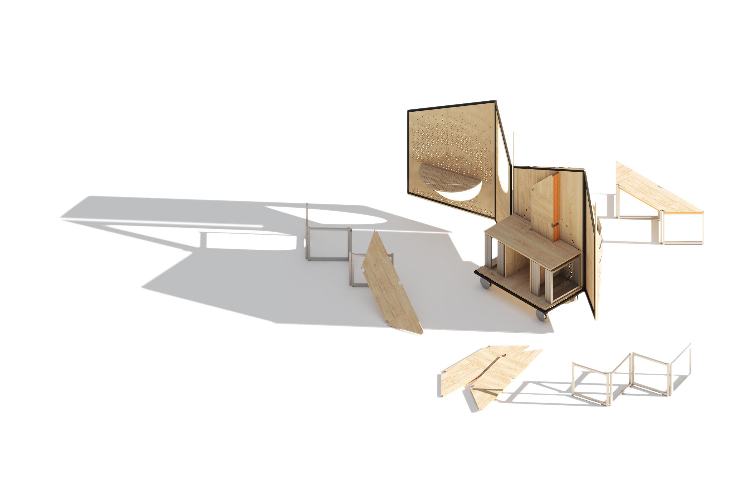 This project was completed in a two-week intensive Design-Build course at the Daniels Faculty of Architecture, Landscape, and Design at University of Toronto. The idea was to design and build a mobile structure for this important community organization that could function as an armature to take up (public) space, while acting as a storage unit in their tiny office. A fast-paced design and building exercise to produce a flexible structure for the community, with the community.