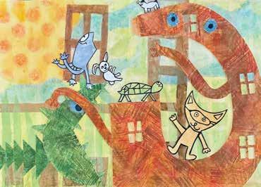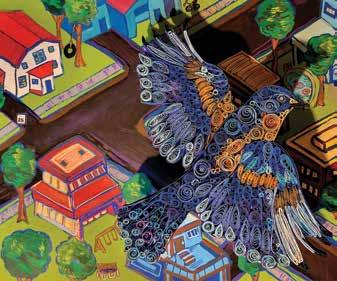 “I imagine that Richard drew a landscape inspired by the composition known as a ‘bird’s eye view’. His drawing shows a neighborhood and what appears to be a large bird in the foreground. His drawing inspired me to create my own composition demonstrating a ‘bird’s eye view’. I also incorporated a bird flying over the neighborhood using paper quilling and some creative balance and movement. When I created the neighborhood, I tried to incorporate memories from childhood such as the tire swing in a tree. REIMAGINE gives me the opportunity to see the world through a young artist’s eyes!”