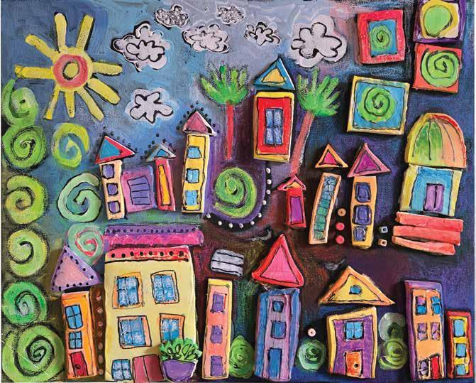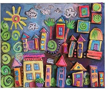 PAT GERHARD, “So Many Buildings”, Acrylic Paint, Clay, Pencils and Crayons, 16 x 20 Inspired by Adelaide’s drawing, Grade 1, The Lexington School