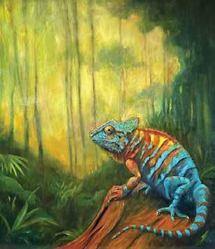 “In reimagining Lauren’s work, the chameleon, for me, becomes a symbol of joy in transformation. Resting deep in the jungle, he wears the colors of his world with pride—no longer hidden, but celebrated. This painting is a reminder that harmony with nature is not about disappearing into it, but about belonging so deeply that one’s true colors shine.”