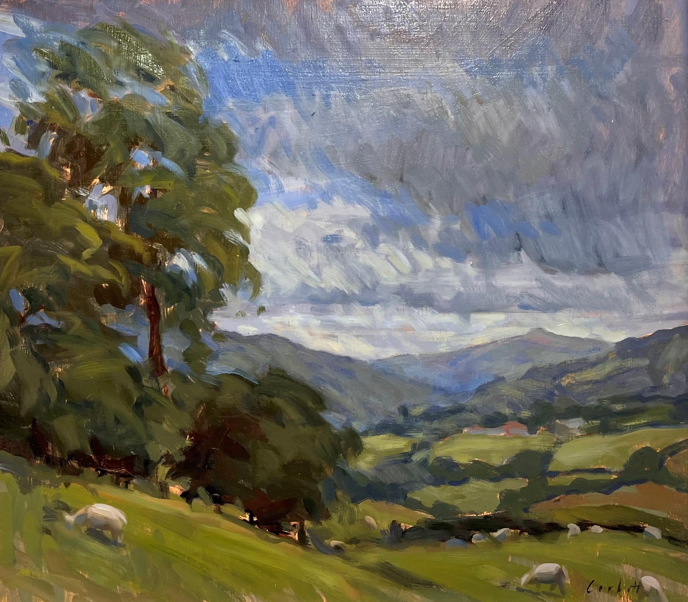 Working in South Wales Ed Woolley has established an attractive and contemporary style to depict the varied landscape that he loves. Working in oils he captures the bold skies and changing scenery with imagination and brilliant control of line and colour. This painting is Cwmcarn Mountain in autumn.