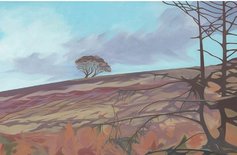 Rather than a literal interpretation of the surrounding landscape, Jane’s work hints at shapes and forms with her bold use of colour and marks. Her work features many shades of blues, purples and greys, as well as splashes of earthy reds and oranges, but there is always a ray of light that shines through.