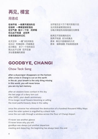Goodbye, Changi Chow Teck Seng after a skyscraper disappears on the horizon after a tree in Changi is cut on the earth in the air, your breath is the only thing missing in this world, you will never know you are my last memory after an airplane loses contact in the sky the last page of a diary torn out after SARS, your death anniversary I’ll no longer recall flowers blooming or wilting the most painful beauty deep in the valley once the universe has witnessed the destruction of a hundred thousand Milky Ways once the solar system is engulfed by a black hole once the sun calls through a window across the floor of Changi Airport I’ll never see another glance I’ll never know why you left goodbye was always just another departure meeting and departing, the beginning has always been the end 4