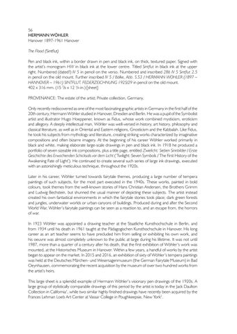 56 HERMANN WÖHLER Hanover 1897-1961 Hanover The Flood (Sintflut) Pen and black ink, within a border drawn in pen and black ink, on thick, textured paper. Signed with the artist’s monogram HW in black ink at the lower centre. Titled Sintflut in black ink at the upper right. Numbered (dated?) IV 5 in pencil on the verso. Numbered and inscribed 286 IV 5 Sintflut 2.5 in pencil on the old mount. Further inscribed IV 5 / Bölke, Abb. S.53 / HERMANN WOHLER (1897 – HANNOVER – 1961) SINTFLUT. FEDERZEICHNUNG 1925/29 in pencil on the old mount. 402 x 316 mm. (15 7/8 x 12 1/4 in.) [sheet] PROVENANCE: The estate of the artist; Private collection, Germany. Only recently rediscovered as one of the most fascinating graphic artists in Germany in the first half of the 20th century, Hermann Wöhler studied in Hanover, Dresden and Berlin. He was a pupil of the Symbolist artist and illustrator Hugo Hoeppener, known as Fidus, whose work combined mysticism, eroticism and allegory. A deeply intellectual man, Wöhler was well-versed in history, art history, philosophy and classical literature, as well as in Oriental and Eastern religions, Gnosticism and the Kabbalah. Like Fidus, he took his subjects from mythology and literature, creating striking works characterized by imaginative compositions and often bizarre imagery. At the beginning of his career Wöhler worked primarily in black and white, making elaborate large-scale drawings in pen and black ink. In 1918 he produced a portfolio of seven sizeable ink compositions, plus a title page, entitled Zwielicht: Sieben Sinnbilder / Erste Geschichte des Erwachenden Schicksals vor dem Licht (‘Twilight: Seven Symbols / The First History of the Awakening Fate of Light’). He continued to create several such series of large ink drawings, executed with an astonishingly meticulous technique, throughout the 1920s. Later in his career, Wöhler turned towards fairytale themes, producing a large number of tempera paintings of such subjects, for the most part executed in the 1940s. These works, painted in bold colours, took themes from the well-known stories of Hans Christian Andersen, the Brothers Grimm and Ludwig Bechstein, but shunned the usual manner of depicting these subjects. The artist instead created his own fantastical environments in which the fairytale stories took place; dark green forests and jungles, underwater worlds or urban canyons of buildings. Produced during and after the Second World War, Wöhler’s fairytale paintings can be seen as a reaction to, and an escape from, the horrors of war. In 1923 Wöhler was appointed a drawing teacher at the Staatliche Kunsthochschule in Berlin, and from 1934 until his death in 1961 taught at the Pädagogischen Kunsthochschule in Hanover. His long career as an art teacher seems to have precluded him from selling or exhibiting his own work, and his oeuvre was almost completely unknown to the public at large during his lifetime. It was not until 1987, more than a quarter of a century after his death, that the first exhibition of Wöhler’s work was mounted, at the Historisches Museum in Hanover. Within a few years, a handful of works by the artist began to appear on the market. In 2015 and 2016, an exhibition of sixty of Wöhler’s tempera paintings was held at the Deutsches Märchen- und Wesersagenmuseum (the German Fairytale Museum) in Bad Oeynhausen, commemorating the recent acquisition by the museum of over two hundred works from the artist’s heirs. This large sheet is a splendid example of Hermann Wöhler’s visionary pen drawings of the 1920s. A large group of stylistically comparable drawings of this period by the artist is today in the Jack Daulton Collection in California1, while two similar highly finished drawings have recently been acquired by the Frances Lehman Loeb Art Center at Vassar College in Poughkeepsie, New York2.