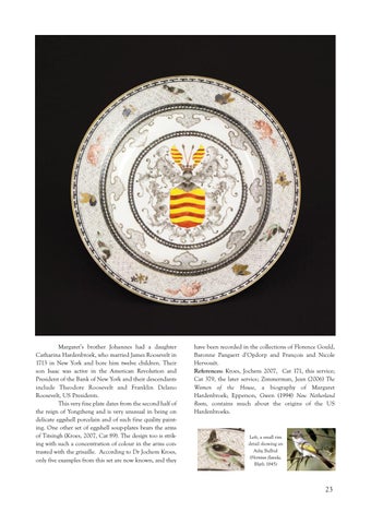 Margaret’s brother Johannes had a daughter Catharina Hardenbroek, who married James Roosevelt in 1713 in New York and bore him twelve children. Their son Isaac was active in the American Revolution and President of the Bank of New York and their descendants include Theodore Roosevelt and Franklin Delano Roosevelt, US Presidents. This very fine plate dates from the second half of the reign of Yongzheng and is very unusual in being on delicate eggshell porcelain and of such fine quality painting. One other set of eggshell soup-plates bears the arms of Titsingh (Kroes, 2007, Cat 89). The design too is striking with such a concentration of colour in the arms contrasted with the grisaille. According to Dr Jochem Kroes, only five examples from this set are now known, and they