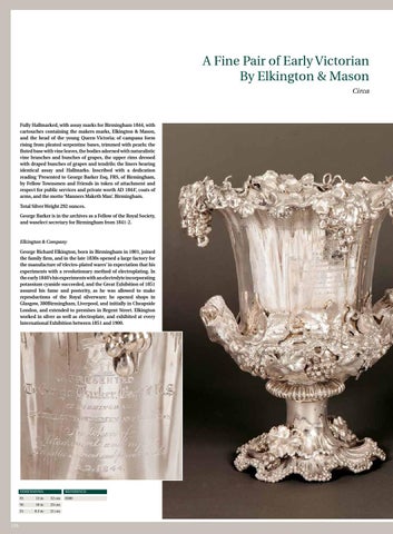 Elkington & Company George Richard Elkington, born in Birmingham in 1801, joined the family firm, and in the late 1830s opened a large factory for the manufacture of ‘electro-plated wares’ in expectation that his experiments with a revolutionary method of electroplating. In the early 1840’s his experiments with an electrolyte incorporating potassium cyanide succeeded, and the Great Exhibition of 1851 assured his fame and posterity, as he was allowed to make reproductions of the Royal silverware; he opened shops in Glasgow, 380Birmingham, Liverpool, and initially in Cheapside London, and extended to premises in Regent Street. Elkington worked in silver as well as electroplate, and exhibited at every International Exhibition between 1851 and 1900.
