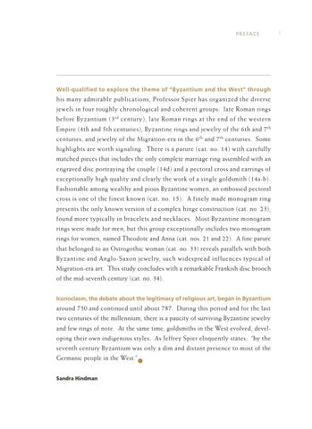 his many admirable publications, Professor Spier has organized the diverse jewels in four roughly chronological and coherent groups: late Roman rings before Byzantium (3 r d century), late Roman rings at the end of the western Empire (4th and 5th centuries), Byzantine rings and jewelry of the 6th and 7 th centuries, and jewelry of the Migration-era in the 6 th and 7 th centuries. Some highlights are worth signaling. There is a parure (cat. no. 14) with carefully matched pieces that includes the only complete marriage ring assembled with an engraved disc portraying the couple (14d) and a pectoral cross and earrings of exceptionally high quality and clearly the work of a single goldsmith (14a-b). Fashionable among wealthy and pious Byzantine women, an embossed pectoral cross is one of the finest known (cat. no. 15). A finely made monogram ring presents the only known version of a complex hinge construction (cat. no. 23), found more typically in bracelets and necklaces. Most Byzantine monogram rings were made for men, but this group exceptionally includes two monogram rings for women, named Theodote and Anna (cat. nos. 21 and 22). A fine parure that belonged to an Ostrogothic woman (cat. no. 33) reveals parallels with both Byzantine and Anglo-Saxon jewelry, such widespread influences typical of Migration-era art. This study concludes with a remarkable Frankish disc brooch of the mid-seventh century (cat. no. 34). Iconoclasm, the debate about the legitimacy of religious art, began in Byzantium