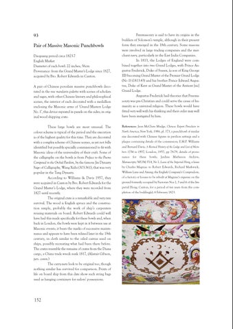 93 Pair of Massive Masonic Punchbowls Daoguang period circa 1823-7 English Market Diameter of each bowl: 22 inches; 56cm Provenance: from the Grand Master's Lodge since 1827, acquired by Bro. Robert Edwards in Canton. A pair of Chinese porcelain massive punchbowls decorated in the rose mandarin palette with scenes of scholars and sages, with other Chinese literary and philosophical scenes, the interior of each decorated with a medallion enclosing the Masonic arms of ‘Grand Masters Lodge No. 1’, this device repeated in panels on the sides; in original wood shipping crate. These large bowls are most unusual. The colour scheme is typical of the period and the execution is of the highest quality for this time. They are decorated with a complex scheme of Chinese scenes, as yet not fully identified but possibly specially commissioned to fit with Masonic ideas of the universality of their craft. Some of the calligraphy on the bowls is from Preface to the Poems Composed in the Orchid Pavilion, by the famous Jin Dynasty Sage of Calligraphy, Wang Xizhi (303-361), that was very popular in the Tang Dynasty. According to Williams & Davis 1957, they were acquired in Canton by Bro. Robert Edwards for the Grand Master’s Lodge, where they were recorded from 1827 until recently. The original crate is a remarkable and very rare survival. The wood is English spruce and the construction simple, probably the work of ship’s carpenters reusing materials on board. Robert Edwards could well have had this made specifically for these bowls and, when back in London, the bowls were kept in it between use at Masonic events; it bears the marks of successive maintenance and appears to have been relined later in the 19th century, in cloth similar to the oiled canvas used on ships, possibly recreating what had been there before. The crates resemble the remains of crates from the Diana cargo, a China trade wreck sunk 1817, (Alistair Gibson, pers. comm.) The carry-nets look to be original too, though nothing similar has survived for comparison. Prints of life on board ship from this date show such string bags used as hanging containers for sailors’ possessions.