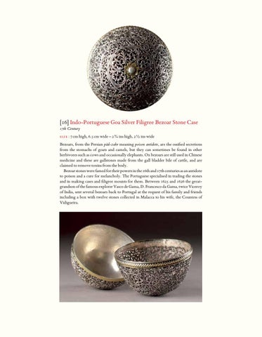 s i z e : 7 cm high, 6.5 cm wide – 2¾ ins high, 2½ ins wide Bezoars, from the Persian påd-zahr meaning poison antidote, are the ossiWed secretions from the stomachs of goats and camels, but they can sometimes be found in other herbivores such as cows and occasionally elephants. Ox bezoars are still used in Chinese medicine and these are gallstones made from the gall bladder bile of cattle, and are claimed to remove toxins from the body. Bezoar stones were famed for their powers in the 16th and 17th centuries as an antidote to poison and a cure for melancholy. The Portuguese specialised in trading the stones and in making cases and Wligree mounts for them. Between 1625 and 1626 the greatgrandson of the famous explorer Vasco de Gama, D. Francesco da Gama, twice Viceroy of India, sent several bezoars back to Portugal at the request of his family and friends including a box with twelve stones collected in Malacca to his wife, the Countess of Vidigueira.