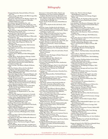 Robins, Gay; The Art of Ancient Egypt, British Museum, London 1997 Sandars, N.K; Prehistoric Art in Europe, Penguin Books, 1968 Scammon, Charles. M; The Marine Mammals of the North Western Coast of North America, Dover Publications, 1968 Scott, Jonathan; The Pleasures of Antiquity, Yale, 2003 Sieber, Roy; African Furniture & Household Objects, Indiana University, 1980 Seipel, Wilfred; Exotica, Skira, Vienna, 2000 Selman; 18th Century Ethnographic Collections in the Hancock Museum, Newcastle, 2003 Sharkey, John; Celtic Mysteries, Thames and Hudson, London, 1975 Stanley, Tim; Palace & Mosque, V&A Publications, 2004 Stepan, Peter; Picasso’s Collection of African & Oceanic Art, Prestel, Munich, 2006 Syndram, Dirk; Gems of the Green Vault in Dresden, Koehler and Amelang, Munchen, 2000 Syson, L; and Thornton, D; Objects of Virtue, BM Press, 2001 Tanner, Julia; From Pacific Shores, University of Cambridge, Museum of Archaeology and Anthropology, 1999 Taylor, Colin, F.; The Plains Indian, Salamander Books, 1994 Taylor, Colin, F.; The Native Americans, Tiger Books International, London, 1995 Townsend, Eleanor; Death and Art, V&A Publishing, 2009 Torrence, Gaylord; The Plains Indians Artists of Earth and Sky, Skira Rizzoli, Paris, 2014 Trnek, H and Vassallo e Silva, N; Exotica, Calouste Gulbenkian Foundation, Lisboa, 2001 Trusted, Marjorie; The Making of Sculpture, V&A Publications, 2007 Trusted, Marjorie; Baroque and Later Ivories, V&A Publishing, 2013 Varjola, Pirjo; The Etholén Collection, Vammalan Kirjapaino Oy, Finland, 1990 Vincent, G.T, Brydon, S, Coe, Ralph T; Art of the North American Indians, The Thaw Collection, University of Washington, 2000 Vogel, Susan, M; African Art Western Eyes, Yale University Press, 1997 Waite, D and Conru, K; Solomon Islands Art, 5 Continents Editions, 2008 Walker, R.A; The National Museum of African Art, Smithsonian Institute, Washington, 1999 Walters, Anna Lee; The Spirit of Native America, Chronicle Books, San Francisco, 1989 Wardwell, Allen; Island Ancestors, Univ. of Washington Press, 1994 Warner, J.A; The Life and Art of the North American Indian, Hamlyn, 1997 Waterfield, H; and, King, J.C.H; Provenance, Somogy Art Publishers, 2006 Wild, Anthony; The East India Company, Harper Collins, 1999 Williamson, Paul; Netherlandish Sculpture 1450 – 1550, V&A Publications, 2002 Williamson, Paul; Medieval Ivory Carvings, V&A Publications, 2010 Winters, Laurie; A Renaissance Treasury, Hudson Hill Press, New York, 1999 Woodcock, George; Peoples of the Coast, Hurting Publishing, Edmonton, 1977 Zandvliet, Kees; The Dutch Encounter with Asia 1600–1950, Rijksmueum, 2002 Zimmer, H; The Art of Indian Asia, vol. 1&2, Pantheon Books, 1955 Zwalf, W.; Buddhism Art and Faith, British Museum Publications Ltd., London, 1985 Design and typeset by Prof. Phil Cleaver & Jennifer Penny of impress-publishing.com, o7816 675178 Photography by Phil Connor, 07831 151549 Printed and bound in Great Britain by Pureprint