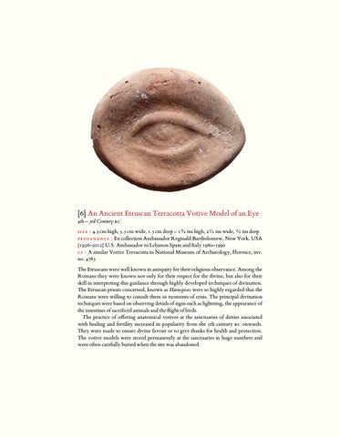 s i z e : 4.5 cm high, 5.5 cm wide, 1.5 cm deep – 1¾ ins high, 2¼ ins wide, ½ ins deep p rov e na nc e : Ex collection Ambassador Reginald Bartholomew, New York, USA (1936–2012) U.S. Ambassador to Lebanon Spain and Italy 1980–1990 c f : A similar Votive Terracotta in National Museum of Archaeology, Florence, inv. no. 4785 The Etruscans were well known in antiquity for their religious observance. Among the Romans they were known not only for their respect for the divine, but also for their skill in interpreting this guidance through highly developed techniques of divination. The Etruscan priests concerned, known as Haruspices were so highly regarded that the Romans were willing to consult them in moments of crisis. The principal divination techniques were based on observing details of signs such as lightning, the appearance of the intestines of sacrificed animals and the flight of birds. The practice of offering anatomical votives at the sanctuaries of deities associated with healing and fertility increased in popularity from the 5th century bc onwards. They were made to ensure divine favour or to give thanks for health and protection. The votive models were stored permanently at the sanctuaries in huge numbers and were often carefully buried when the site was abandoned.