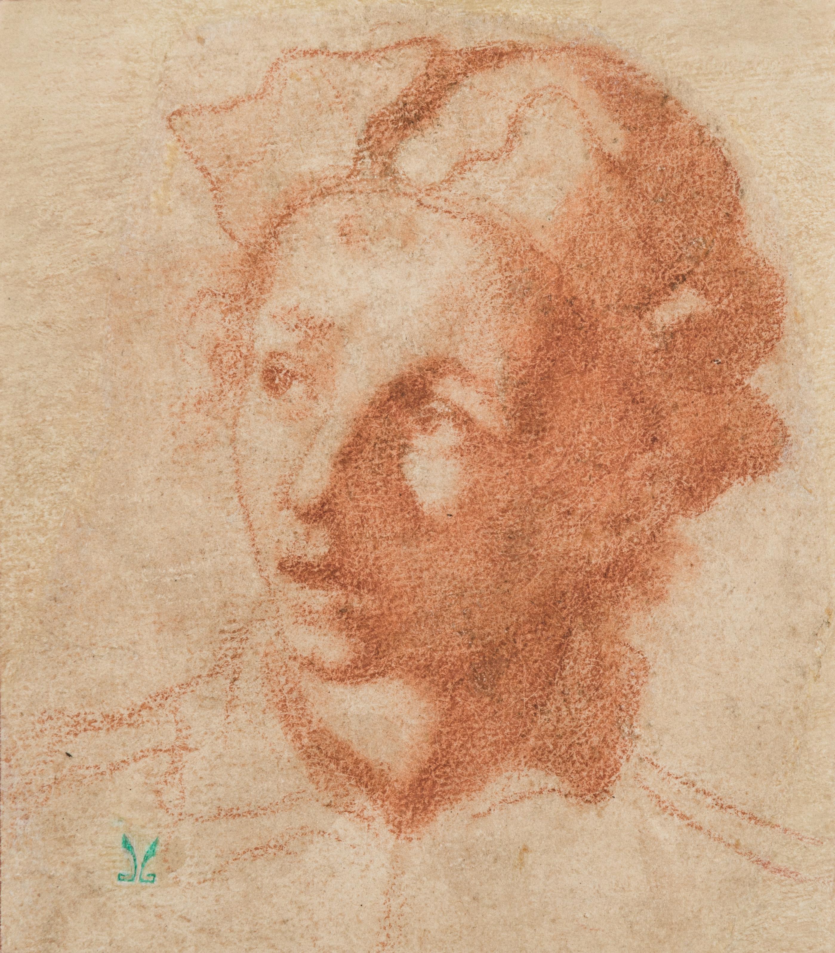 The distinctive cap seen in this small drawing is found in paintings by a number of 17th century Florentine artists, such as Cristofano Allori (1577-1621) and Lorenzo Lippi (1606-1665).
