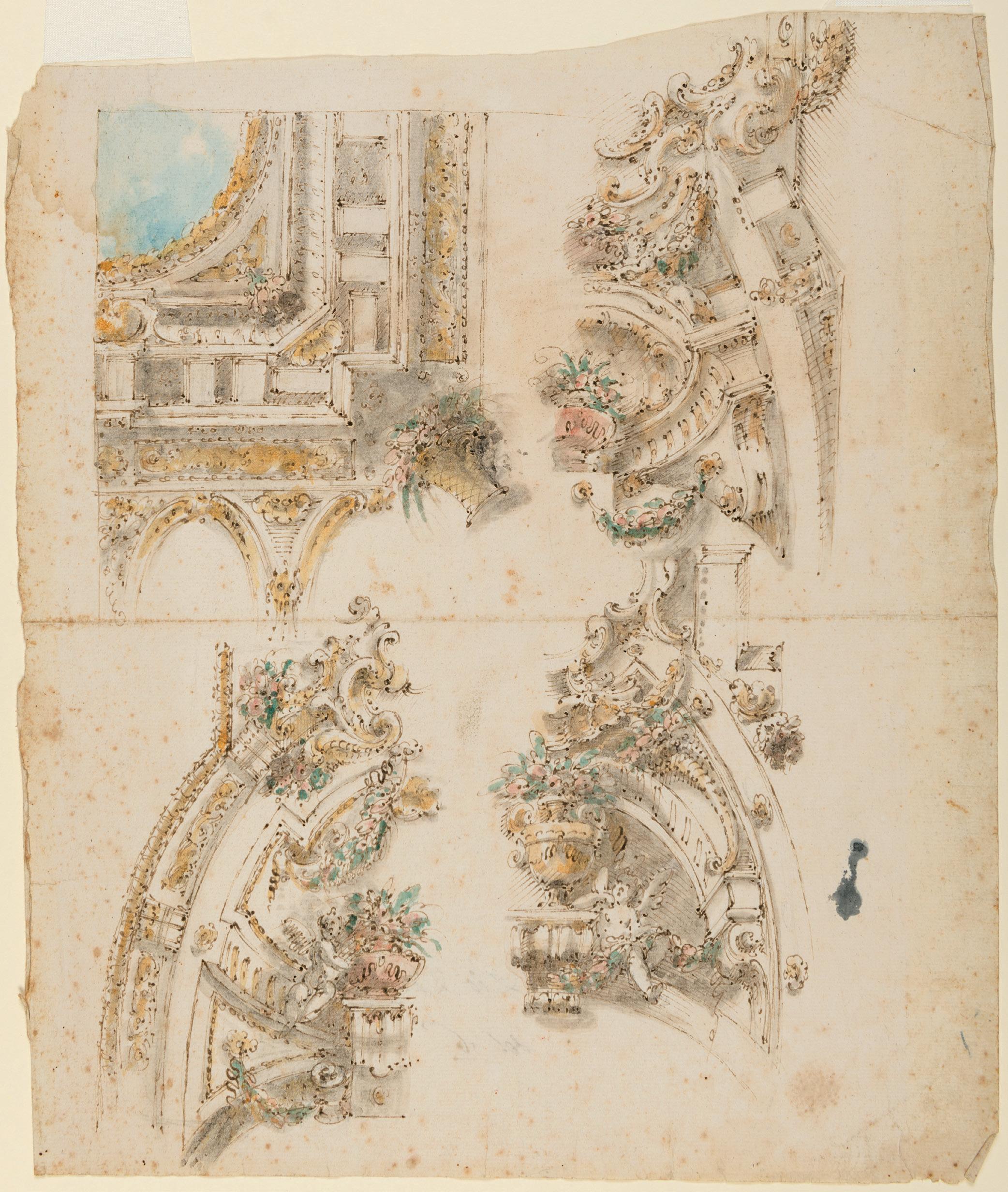 Although he was a prolific draughtsman, drawings for architecture, decorative motifs and metalwork by Volterrano are relatively rare. As Charles McCorquodale has pointed out, ‘Volterrano...allowed his most robust, if controlled, drawing style to emerge in his designs for carving, stuccoes, metalwork and other decoration’, while another scholar has noted that ‘The florid baroque style evident in these drawings, and even the way numerous unfinished sketches are crowded on to the sheet, seem to be inspired by Bernini, whose work Volterrano knew from his two stays in Rome, but the condensed nature of the ornament is characteristically Florentine.’ Volterrano is known to have designed a handful of picture frames; a painting by Paolo Veronese in the collection of the Grand Duke Ferdinando II de’ Medici, for example, is set into an elaborate gilt frame carved by Jacopo Maria Foggini to a design by Volterrano. Other drawings for frames by Volterrano are in the Rijksmuseum in Amsterdam, the Romanian Academy in Bucharest and the Metropolitan Museum of Art in New York.
