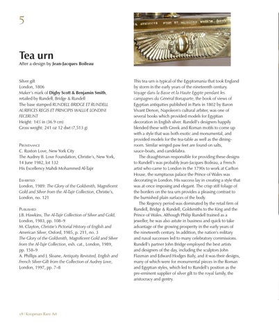 This tea urn is typical of the Egyptomania that took England by storm in the early years of the nineteenth century. Voyage dans la Basse et la Haute Egypte pendant les campagnes du Général Bonaparte, the book of views of Egyptian antiquities published in Paris in 1802 by Baron Vivant Denon, Napoleon’s cultural arbiter, was one of several books which provided models for Egyptian decoration in English silver. Rundell’s designers happily blended these with Greek and Roman motifs to come up with a style that was both exotic and monumental, and provided models for the tea-table as well as the diningroom. Similar winged paw feet are found on salts, sauce-boats, and candelabra. The draughtsman responsible for providing these designs to Rundell’s was probably Jean-Jacques Boileau, a French artist who came to London in the 1790s to work at Carlton House, the sumptuous palace the Prince of Wales was decorating in London. His success lay in creating a style that was at once imposing and elegant. The crisp stiff foliage of the borders on the tea urn provides a pleasing contrast to the burnished plain surfaces of the body. The Regency period was dominated by the retail firm of Rundell, Bridge & Rundell, Goldsmiths to the King and the Prince of Wales. Although Philip Rundell trained as a jeweller, he was also astute in business and quick to take advantage of the growing prosperity in the early years of the nineteenth century. In addition, the nation’s military and naval successes led to many celebratory commissions. Rundell’s partner John Bridge employed the best artists and designers of the day, including the sculptors John Flaxman and Edward Hodges Baily, and it was their designs, many of which were for monumental pieces in the Roman and Egyptian styles, which led to Rundell’s position as the pre-eminent supplier of silver gilt to the royal family, the aristocracy and gentry.