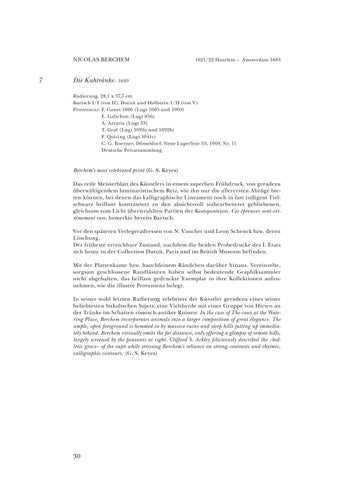Berchem’s most celebrated print (G. S. Keyes) Das reife Meisterblatt des Künstlers in einem superben Frühdruck, von geradezu überwältigendem luminaristischem Reiz, wie ihn nur die allerersten Abzüge bieten können, bei denen das kalligraphische Lineament noch in fast rußigem Tiefschwarz brillant kontrastiert zu den absichtsvoll unbearbeitetet gebliebenen, gleichsam vom Licht überstrahlten Partien der Komposition. Ces épreuves sont extrêmement rare, bemerkte bereits Bartsch. Vor den späteren Verlegeradressen von N. Visscher und Leon Schenck bzw. deren Löschung. Der früheste erreichbare Zustand, nachdem die beiden Probedrucke des I. Etats sich heute in der Collection Dutuit, Paris und im British Museum befinden. Mit der Plattenkante bzw. hauchfeinem Rändchen darüber hinaus. Vereinzelte, sorgsam geschlossene Randläsuren haben selbst bedeutende Graphiksammler nicht abgehalten, das brillant gedruckte Exemplar in ihre Kollektionen aufzunehmen, wie die illustre Provenienz belegt. In seiner wohl letzten Radierung zelebriert der Künstler geradezu eines seiner beliebtesten bukolischen Sujets, eine Viehherde mit einer Gruppe von Hirten an der Tränke im Schatten römisch-antiker Ruinen: In the case of The cows at the Watering Place, Berchem incorporates animals into a larger composition of great elegance. The ample, open foreground is hemmed in by massive ruins and steep hills jutting up immediately behind. Berchem virtually omits the far distance, only offering a glimpse of remote hills, largely screened by the peasants at right. Clifford S. Ackley felicitously described the «balletic grace» of the sujet while stressing Berchem’s reliance on strong contrasts and rhytmic, calligraphic contours. (G. S. Keyes)
