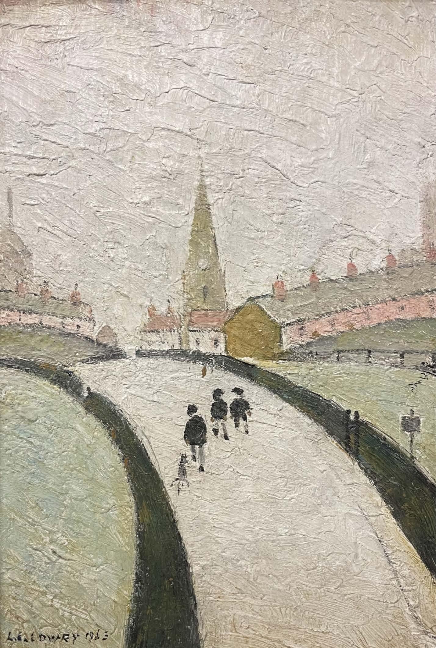 The 1960’s saw Lowry producing an increasing number of small paintings, both landscapes and seascapes. His frequent visits to the North East were very productive but he continued to source subjects closer to his home in Mottram in Longdendale, a village at the foot of the High Peak District in Derbyshire. Lowry was a great rambler, his friend Philip Robertson lived in the town of Glossop in the Peak District and Lowry was an inveterate recorder of places he visited. It is likely that A Country Road is a view in a Pennine town or a composite of such, the church spire certainly resembles that of St. James in Glossop. The lane and village are seen from an aerial perspective levelling out the steepness of the lane up which the boys and dog are walking. The two boys in front conversing one to another, the act of conversing conveyed with such subtlety, a mere fleck of impasto, a minute brushstroke bringing them to life, the third figure, a dog at his heels plods up the hill eyes downcast.