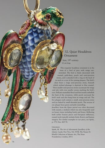 32. Qajar Headdress Ornament Iran, 19th century 12 cm long This exquisite headdress ornament is in the form of a bird of prey with wings outstretched. The bird is finely decorated with enamel, gold-sheet, pearls and semi-precious stones, and is attached with a ring on the back of its neck to a row of five joining plaques. The bird’s chest bears a large semi-precious stone, beneath which stylised plumage is depicted in blue enamel. Three smaller semi-precious stones accentuate the wings and tail, with even smaller stones marking the bird’s eyes. Delicate enamelled floral and bird motifs embellish the back of the ornament, while pearls surround the bird’s neck and also hang from its wings and tail. The five plaques each contain a small, semi-precious stone and are linked by small threaded pearls. The reverse of one plaque bears green and pink enamelling. Jewellery from the Qajar period was often decorated with enamel, a medium which was also frequently used on luxury items including bowls and boxes. Reflecting both earlier Iranian pieces and European influences, enamel work typically includes birds, flowers and human imagery. For similar examples to our piece, see Spink, p. 579, Nos. 469-70. Literature: Spink, M. The Art of Adornment: Jewellery of the Islamic Lands, Part Two, Vol. XVII, The Nasser D. Khalili Collection of Islamic Art, The Nour Foundation, London, 2013.