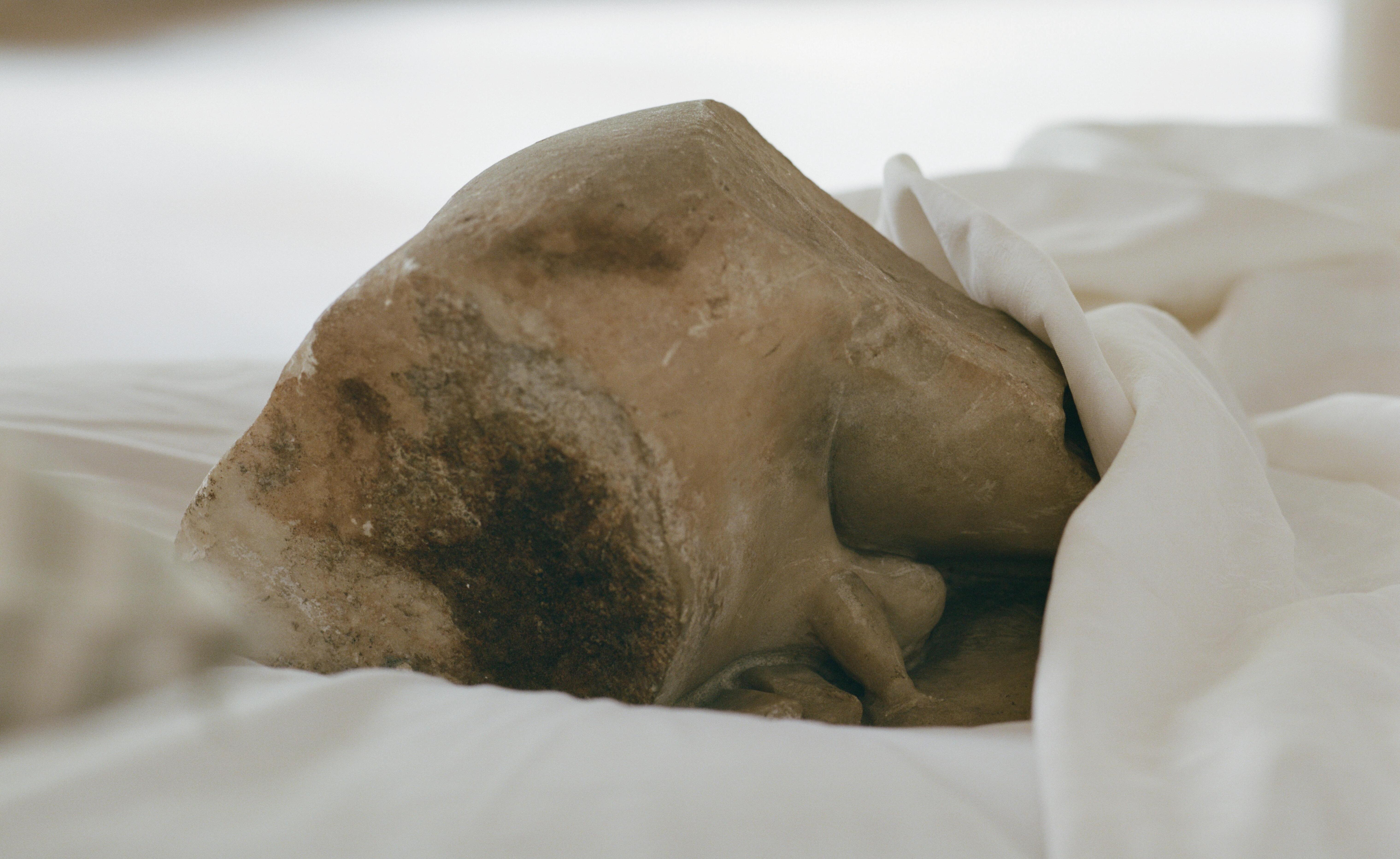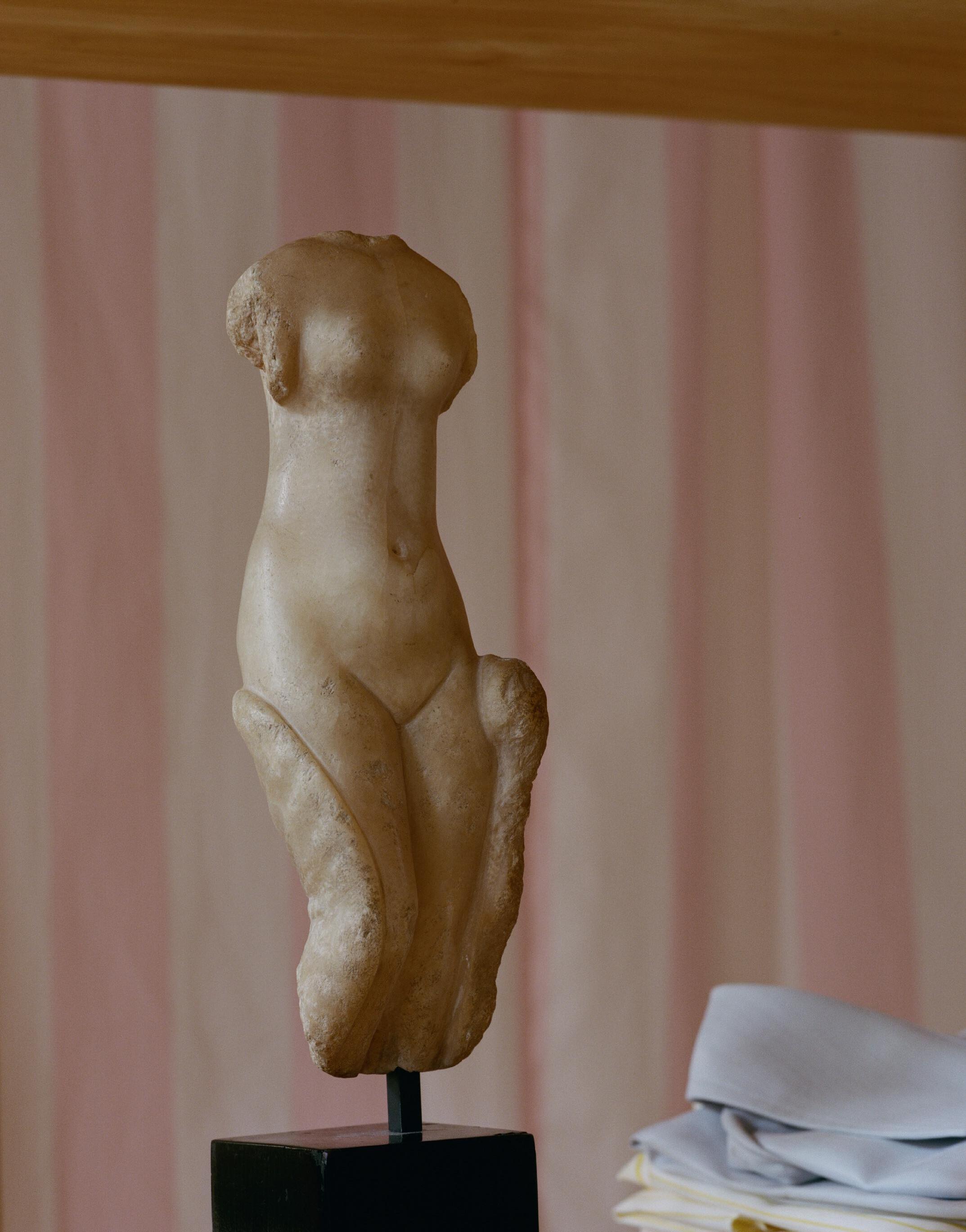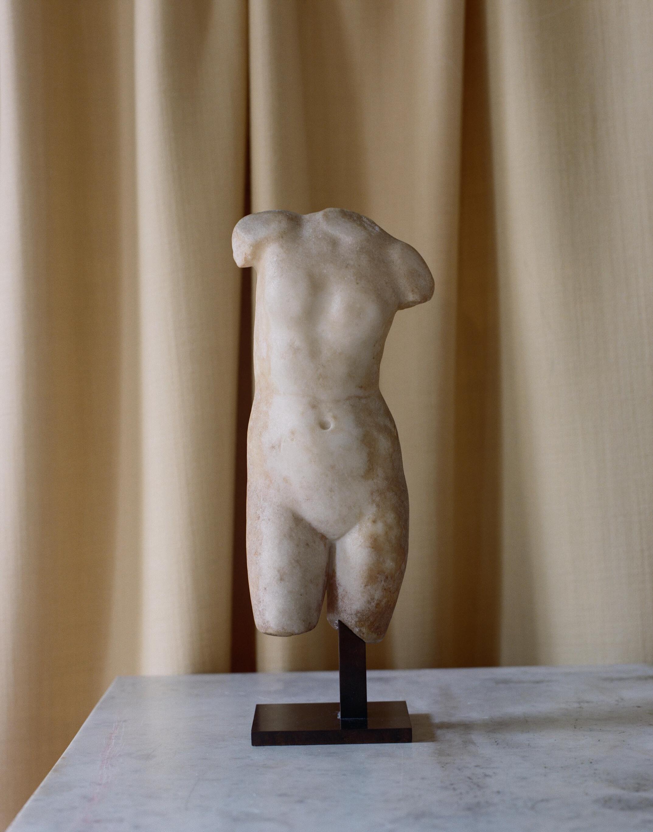 L’esthétique de leurs marbres le permet d’ailleurs. Les « marmor lunense », privilégiés au Ier et au IIe siècles, par leur grain pur, leur blancheur légèrement bleutée et leur robustesse, offrent des patines merveilleuses, dont ils refusent de se priver. Loin des choix radicaux de certains musées ou institutions – nous pensons volontiers aux Marbres des collections Torlonia–, ils ne choisissent et conservent que des statues ou des éléments d’architecture qui présentent des altérations dues à la lente percolation des eaux calcaires, qui offrent à la patine d’origine un côté désaturé, laissent apparaitre des voiles opalins et des efflorescence crayeuses d’un blanc ivoirien. Les fines suintures verticales, souvent irisées d’un ton lactescent ou grège, qui adoucissent le poli initial sont des trésors. Rien n’est plus plaisir, au toucher, que les liserés d’incrustations calcaires qui forme comme une brume pierreuse, un miroitement atténué du grain lunense. Le chatoiement beige rosé des sculptures exhumées des sites humides, responsables d’accumulation de calcite, d’oxydations ferrugineuses, donnant aux reliefs une coloration beige rosé, aux creux des tons cendrés. Les vibrations chromatiques confèrent au marbre une vibration singulière, une palette du temps. De même, chaque reprise devient un vestige de la durée, un hommage discret à ceux qui, avant eux, touchèrent ces pierres. Car les restaurations successives sont autant de dons, et il serait sacrilège de les abolir.