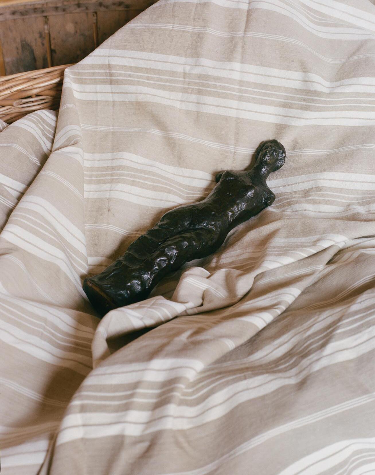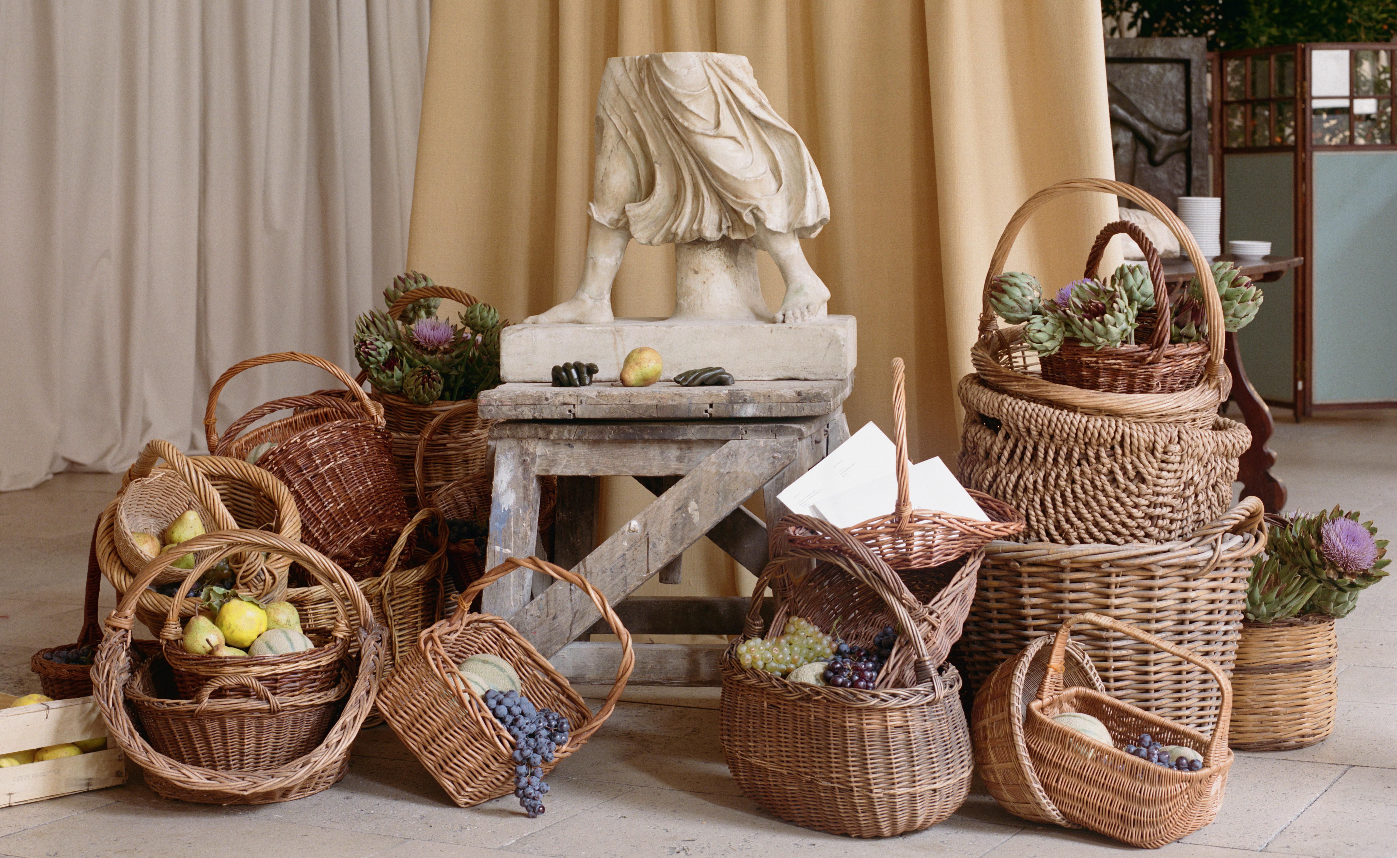 Dans Mythes, un fragment saisissant retient le regard : les jambes d’une Artémis, demeurées seules, des pieds jusqu’aux genoux. Le marbre, à peine doré par les ans, conserve la souplesse d’un drapé que la lumière anime ; les plis, obliques et pleins d’élan, traduisent l’instant suspendu d’une marche divine. Comme les marbriers du XVIIe ou du XVIIIe siècle qui, dans leur ferveur antiquaire, l’avaient munie d’un socle moderne pour en parfaire la silhouette, Simon Porte Jacquemus la ressuscite dans une mise en scène harmonieuse, parmi les vanneries débordantes d’artichauts. Cette Artémis transfigurée en apparition champêtre, écho lointain d’un marbre antique devenu songe d’une déesse en mouvement, glissant parmi les étals d’un marché provençal, un panier de jonc au bras, dans une lumière d’aurore. Les attachements en fer demeurent visibles – stigmates des ajouts du XVIIe ou du XVIIIe siècle, traces de ces mains passées qui voulurent restituer un corps à la déesse mutilée. Les Chenel, fidèles à leur éthique de la transparence, ne les dissimulent point : ils les laissent parler, témoigner du long destin des formes, de cette chaîne ininterrompue où chaque époque, en touchant la matière, y dépose sa propre âme.