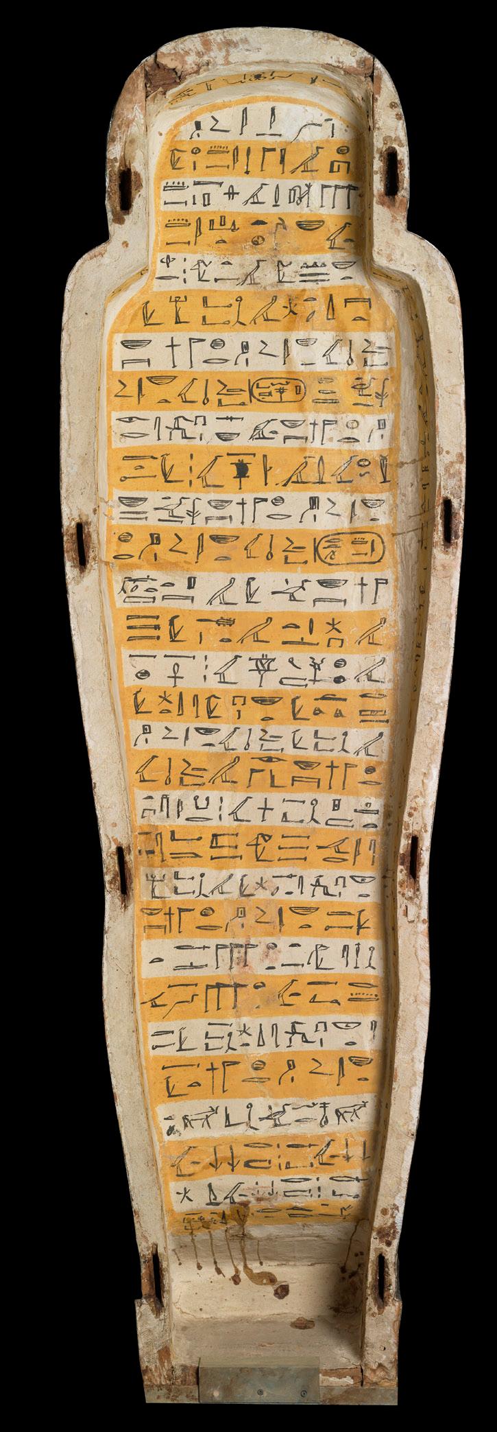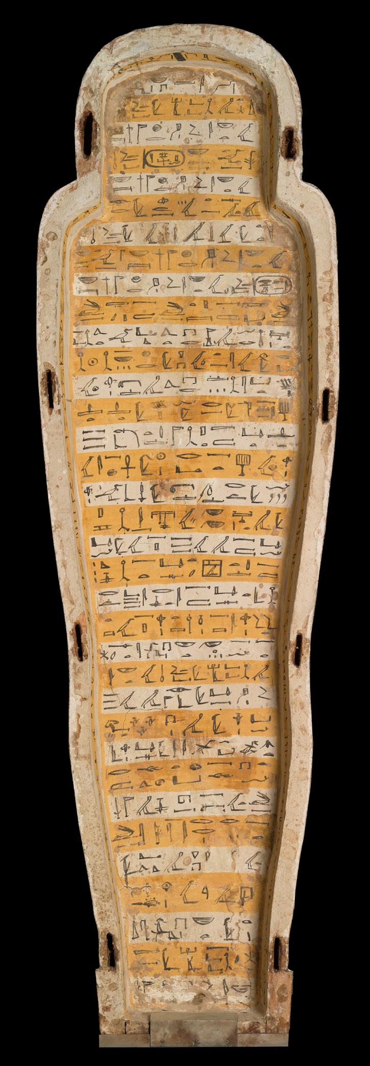 Below Nut’s outspread wings on the torso, the text names the owner of the coffin and gives a version of the 'Nut formula', known from the times of the Pyramid Texts, which assures that Nut will protect the deceased in the netherworld. Further texts follow in rows of short, closely packed columns on either side of an extended axial column. This arrangement recalls the outer bandages of a mummy.