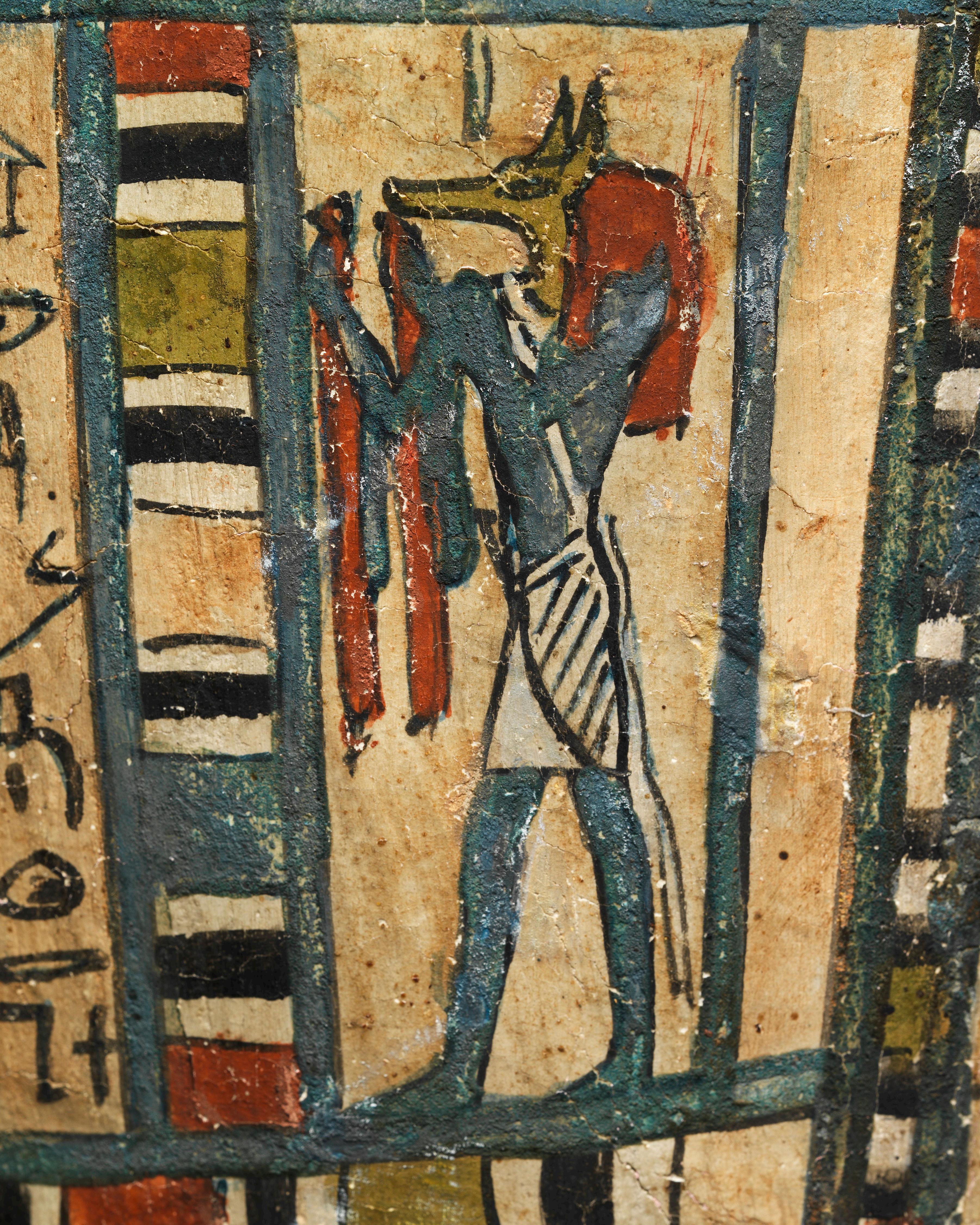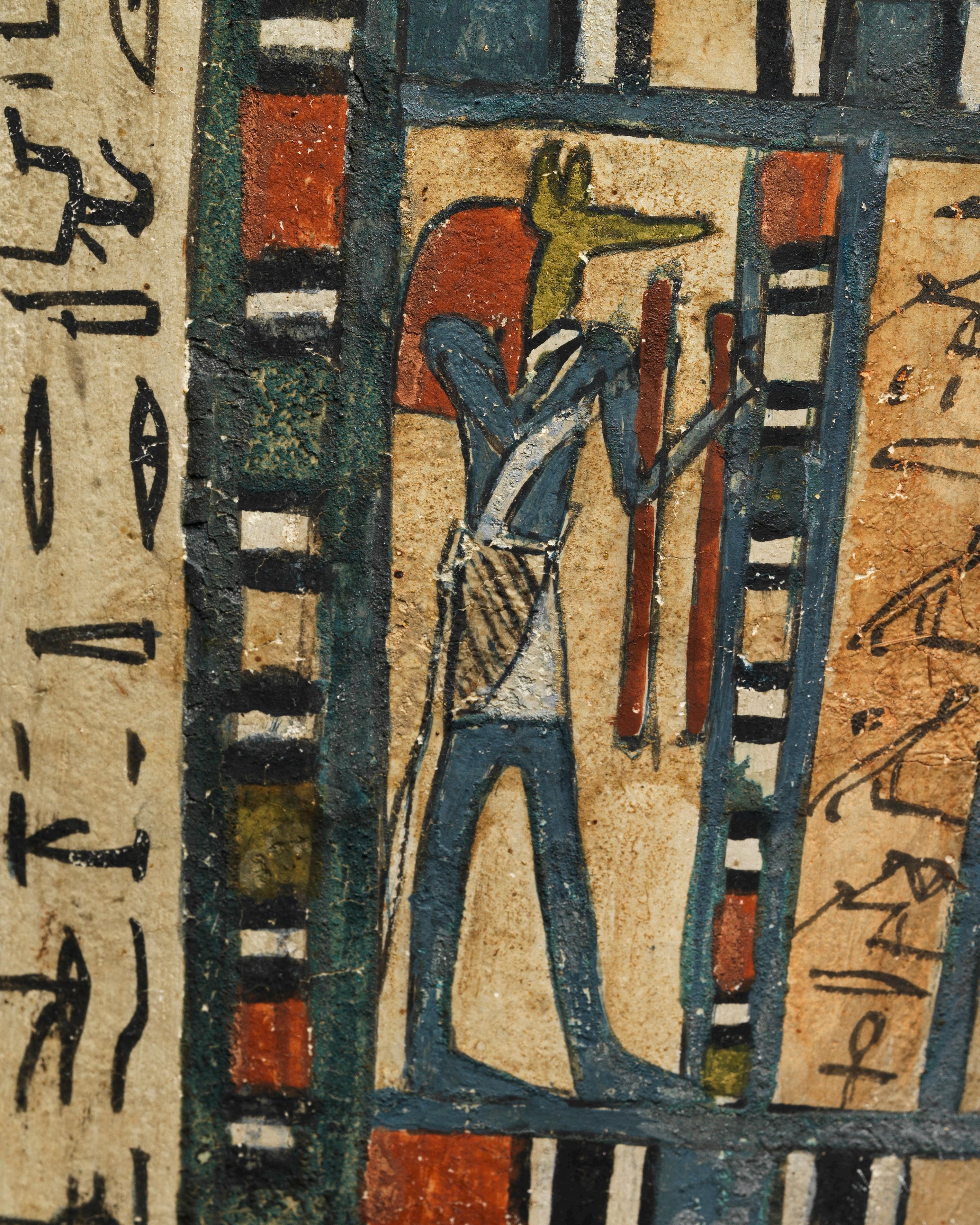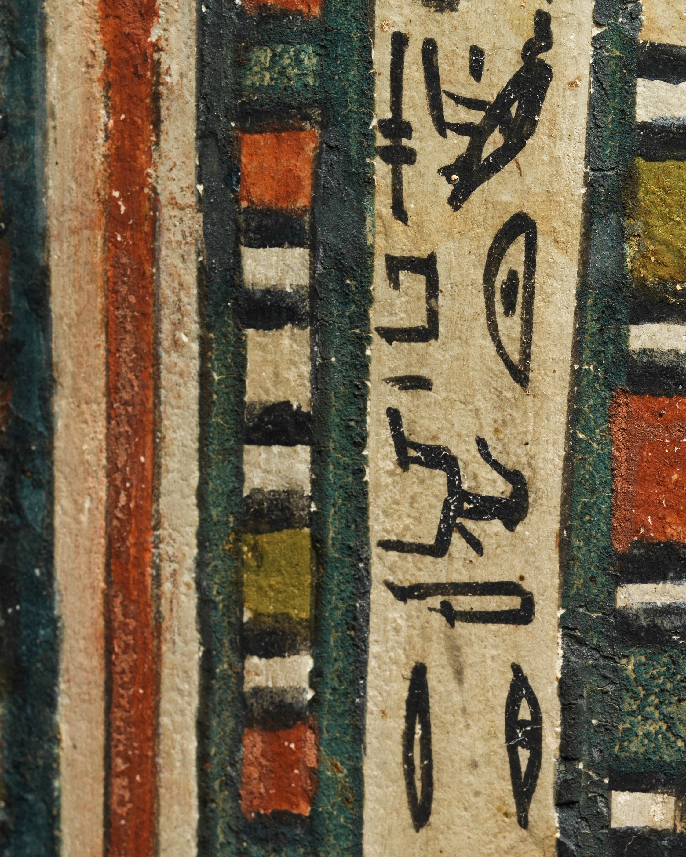 Painted with a palette of rich blues, greens, and reds, the sarcophagus is decorated inside and out in its entirety with apotropaic symbols and hieroglyphic inscriptions. The inner sarcophagus is usually the most personal, with mentions of the deceased's ancestors and titles. In Sopdet-em-haawt’s case, details on her royal lineage are given, alongside passages from the book of the dead.