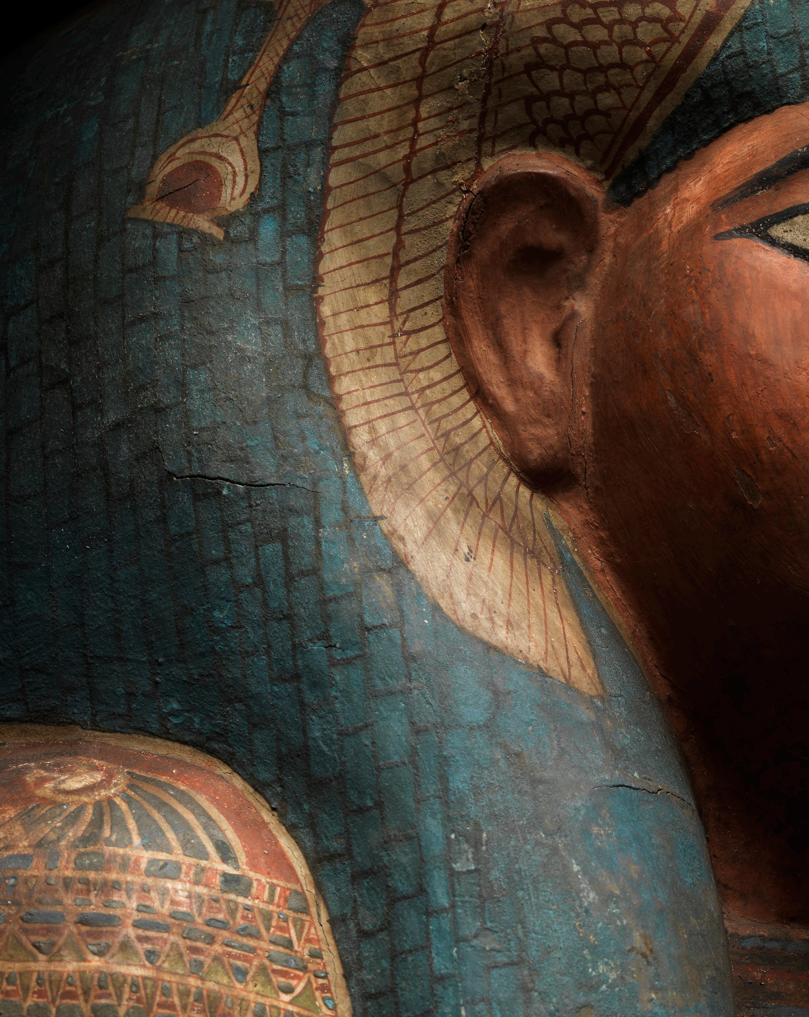 Colourful images of Nut, the winged sky goddess, and the goddess of the afterlife, is painted on the chest and feet of the coffin. On the underside of the coffin is an Apis bull, taking Sopdet-emhaawt’s body on its journey into the afterlife. Various other gods and goddesses important to the protection of her body and its journey are painted down each side of the coffin.