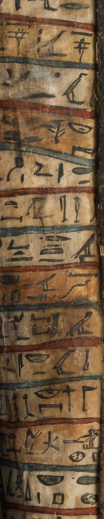 The text of the axial column gives a detailed titulary of the deceased and a spell requiring Nut to return her heart to its right place within her body. Each row of text is devoted to a particular chthonic deity, and framed by an image of the god. For instance, the two upper registers ask for protection from the four sons of Horus, while the row below appeals to Anubis.