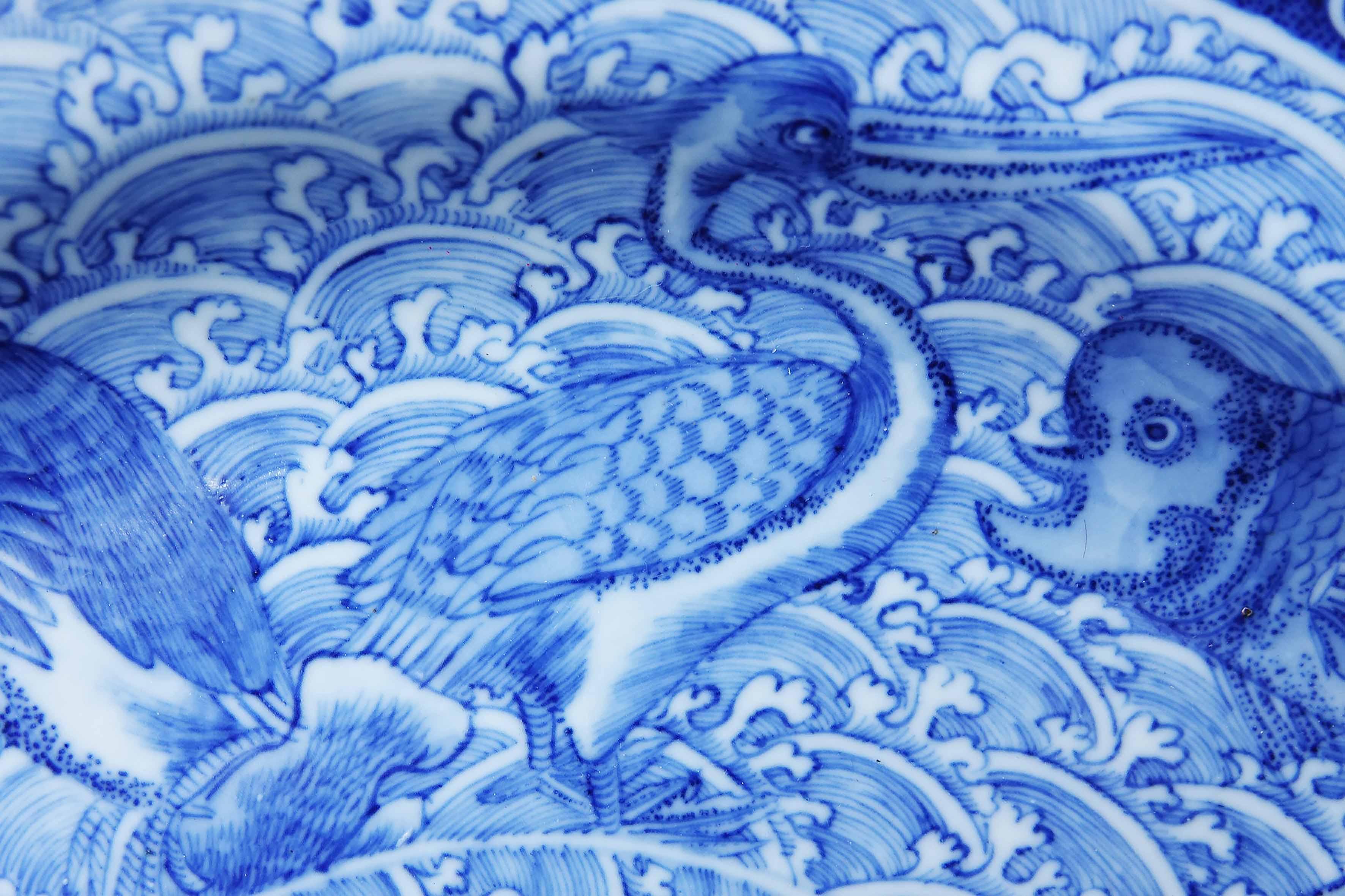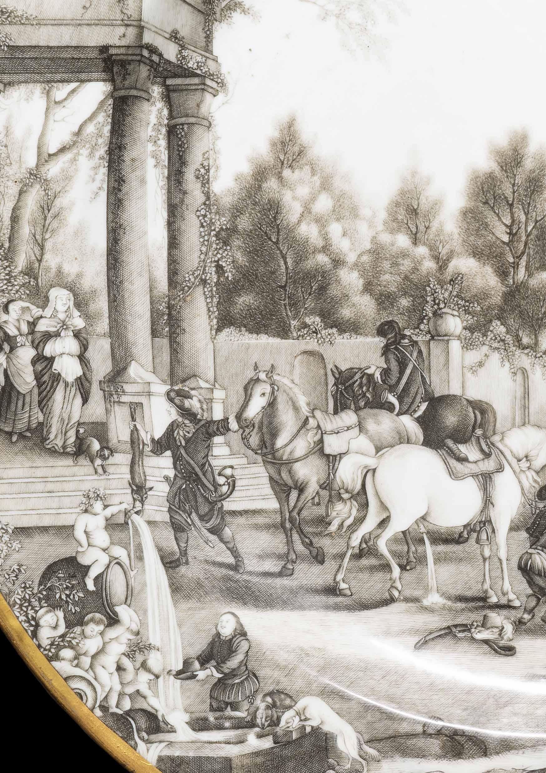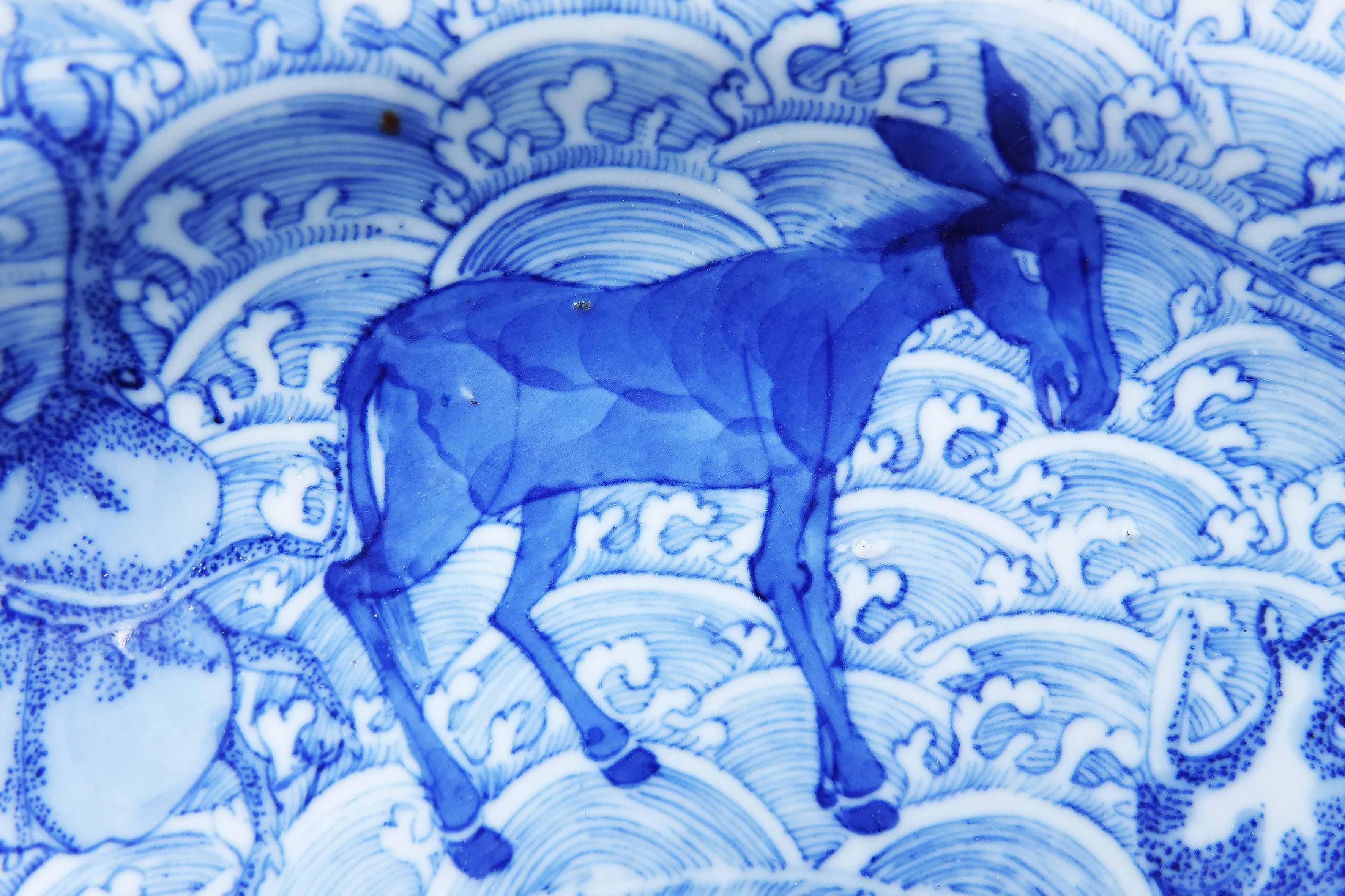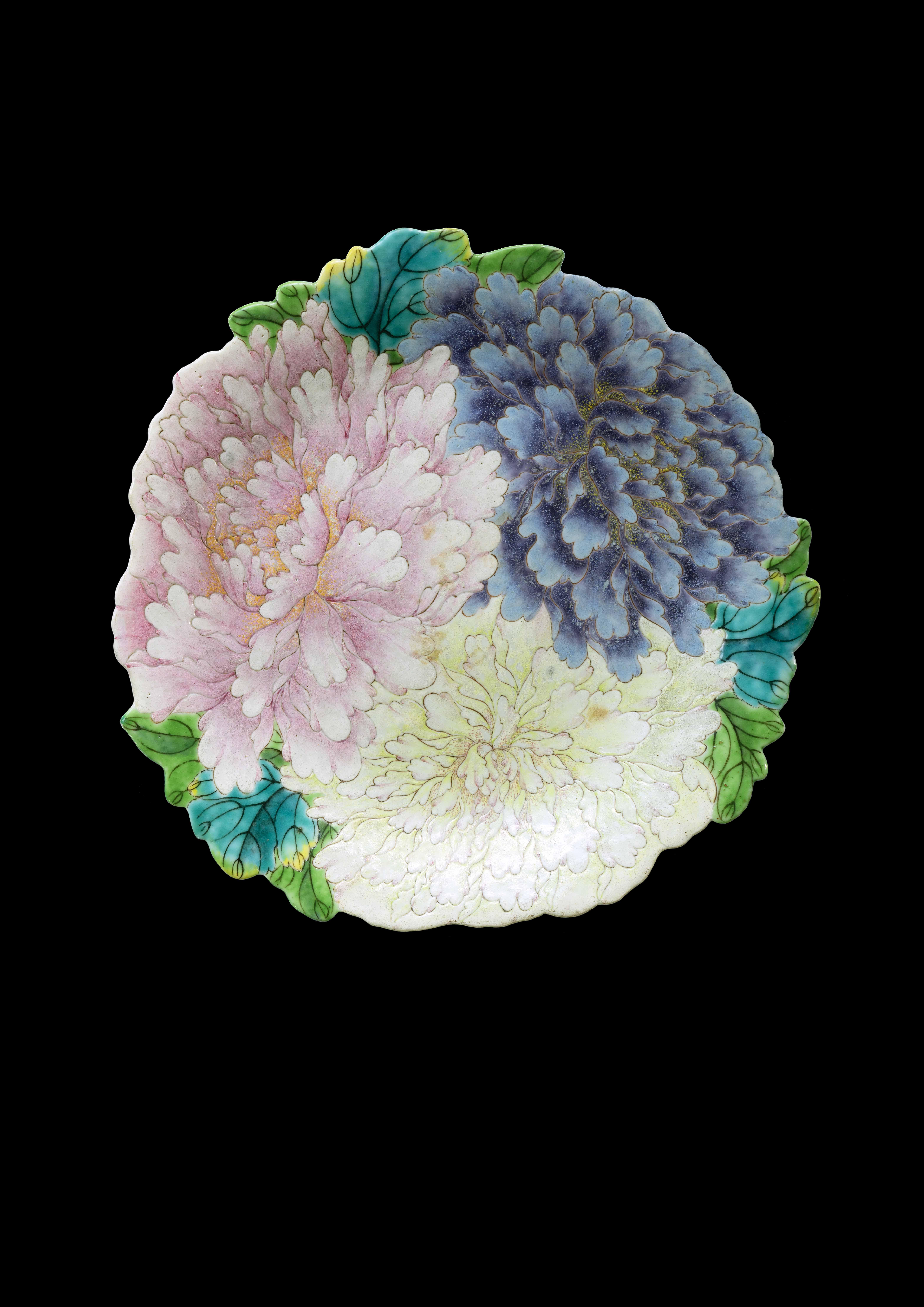 Other exceptional pieces include the baluster vase with the arms of Sichterman with its very appealing squirrel knop, a painted enamel cup and stand exquisitely enamelled with scenes of Roman mythology, a dish formed of three peonies and probably unique and a nineteenth century blue and white charger very finely painted with a menagerie of animals.