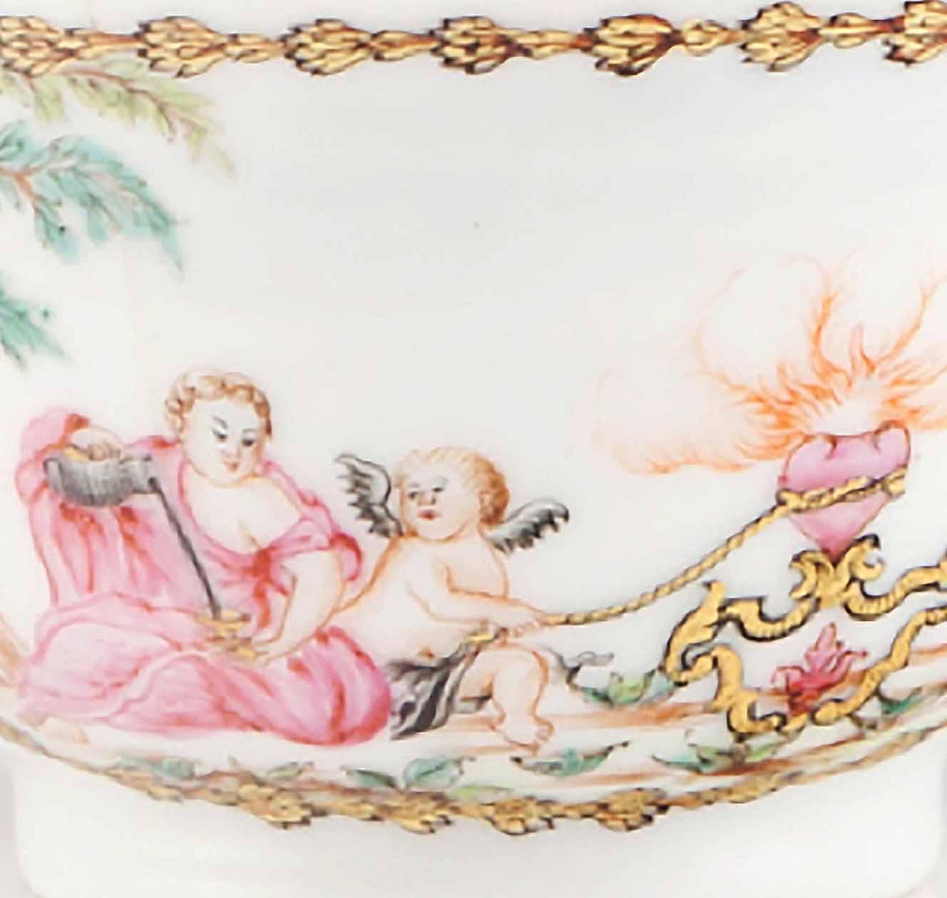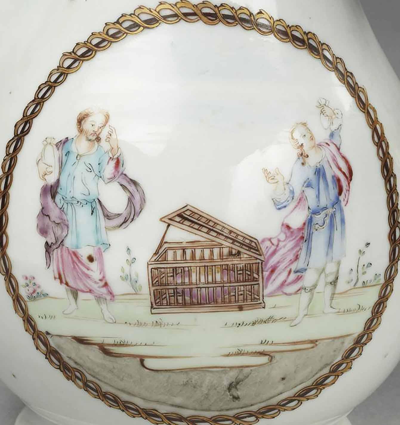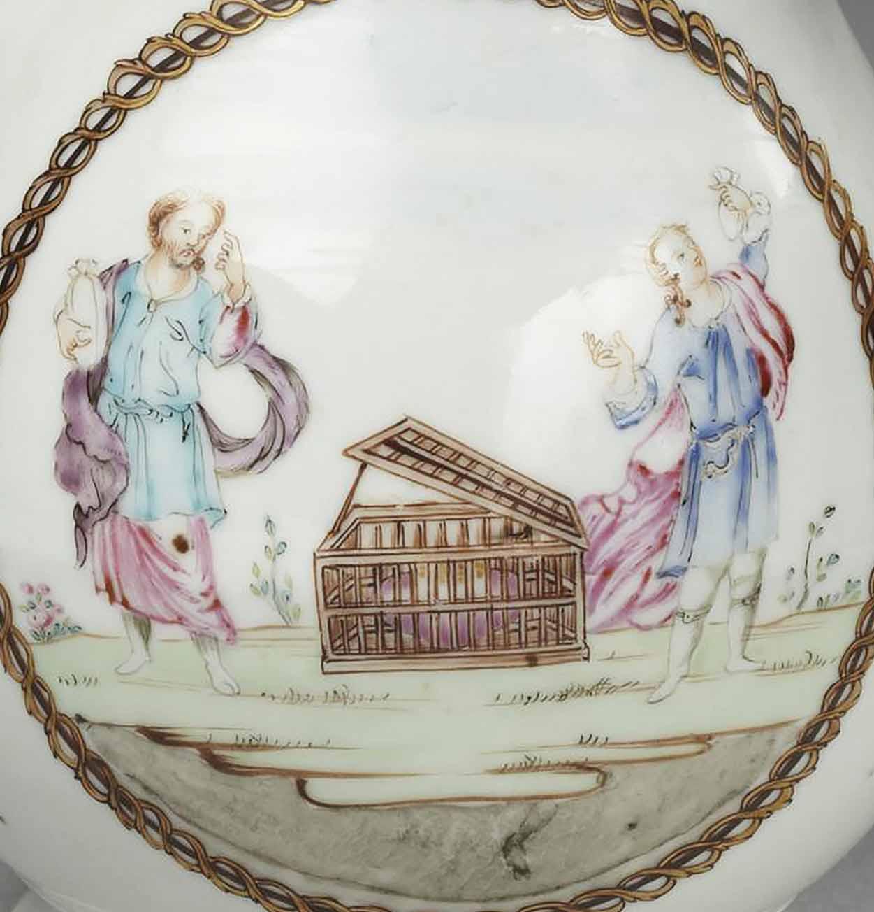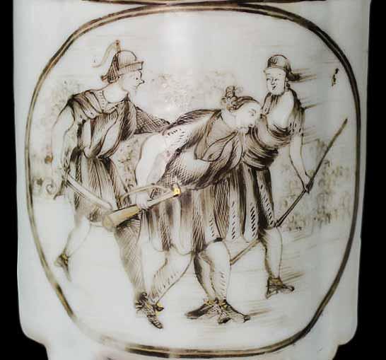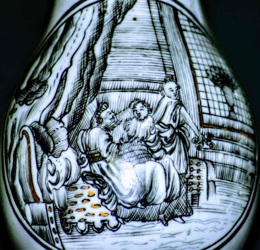 This is a rare example of such an early type of European subject vase. The style is similar to some of the albums of European figures made for the Imperial court (see three examples illustrated, right) and this could have been made as a curiosity for the Chinese market. The shape is unusual and the sparse decoration lacking any borders would have appealed to Chinese taste at this time.