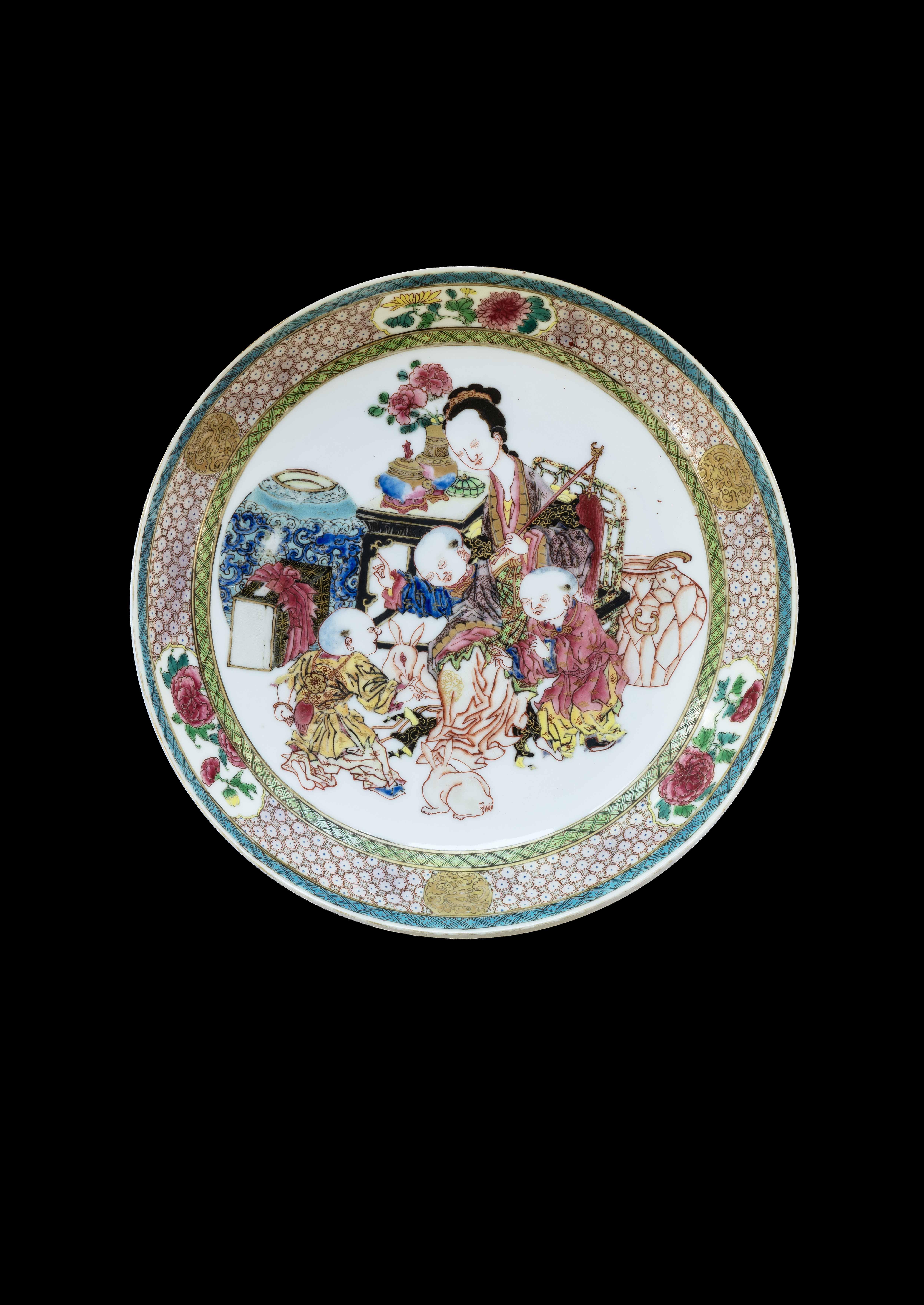 A fine Chinese eggshell porcelain plate decorated in famille rose enamels with a domestic scene of a lady with three boys playing with rabbits, the border with floral reserves on a pink cell diaper.