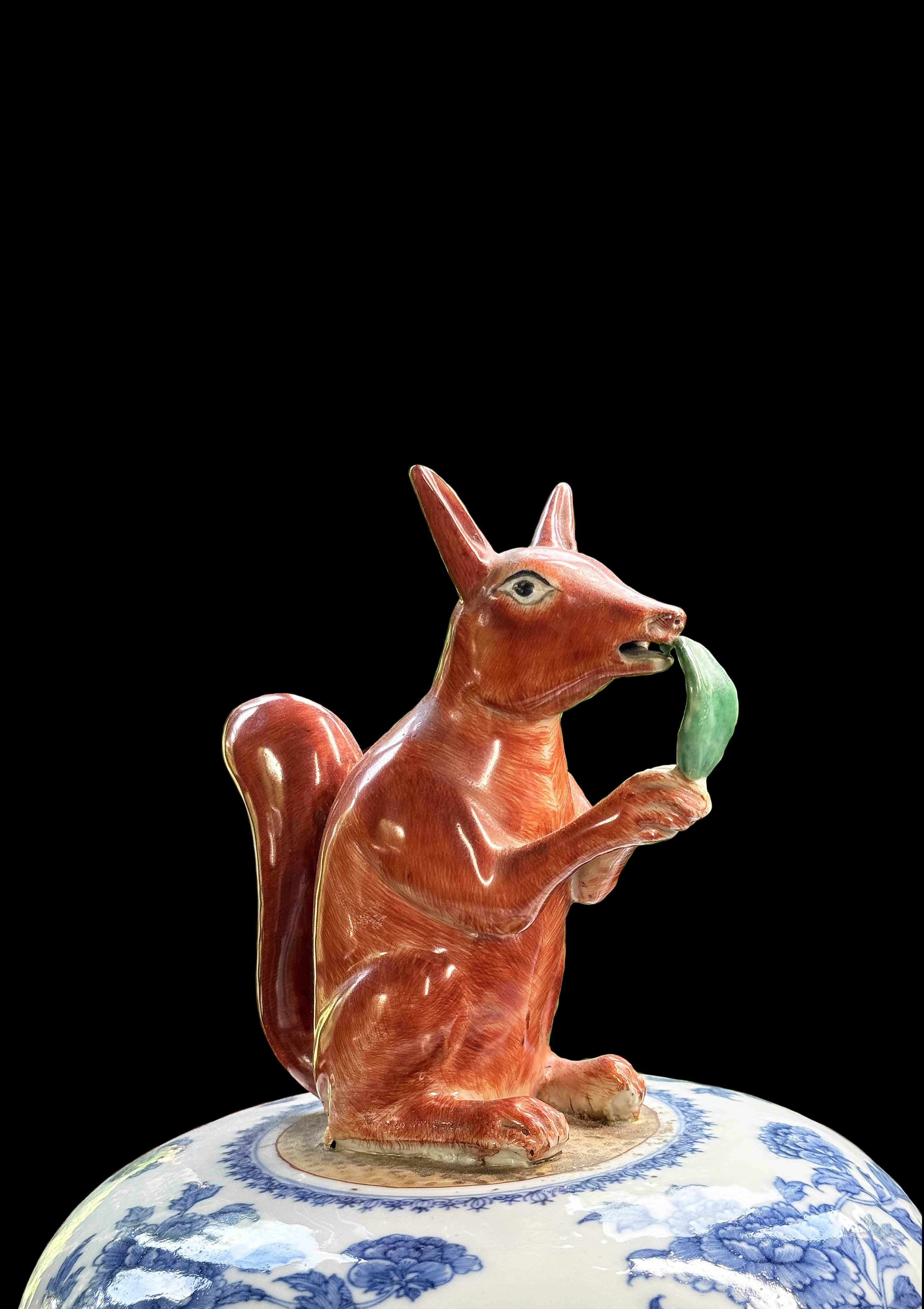 A large baluster vase and cover, decorated in underglaze blue and white with flowers and cell diapers, with an armorial cartouche in sepia, iron red, green enamel and gilding, the cover with a finial modelled as a squirrel holding a green leaf.